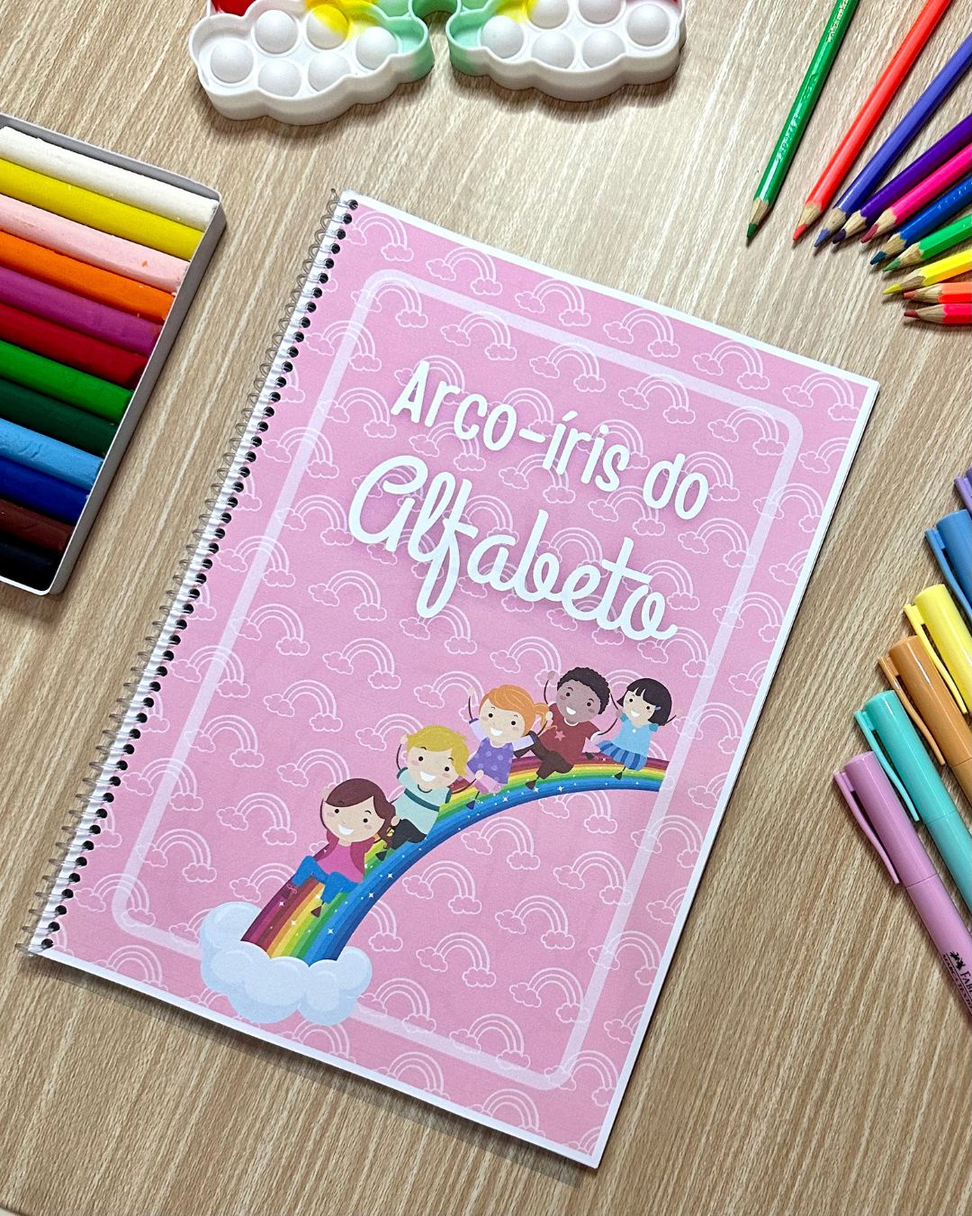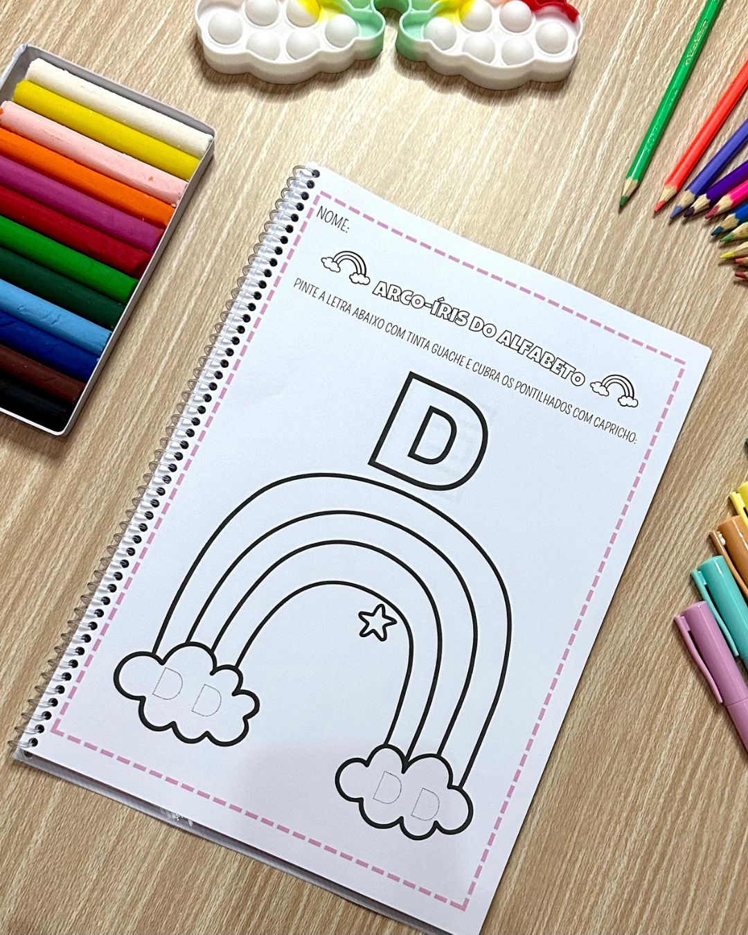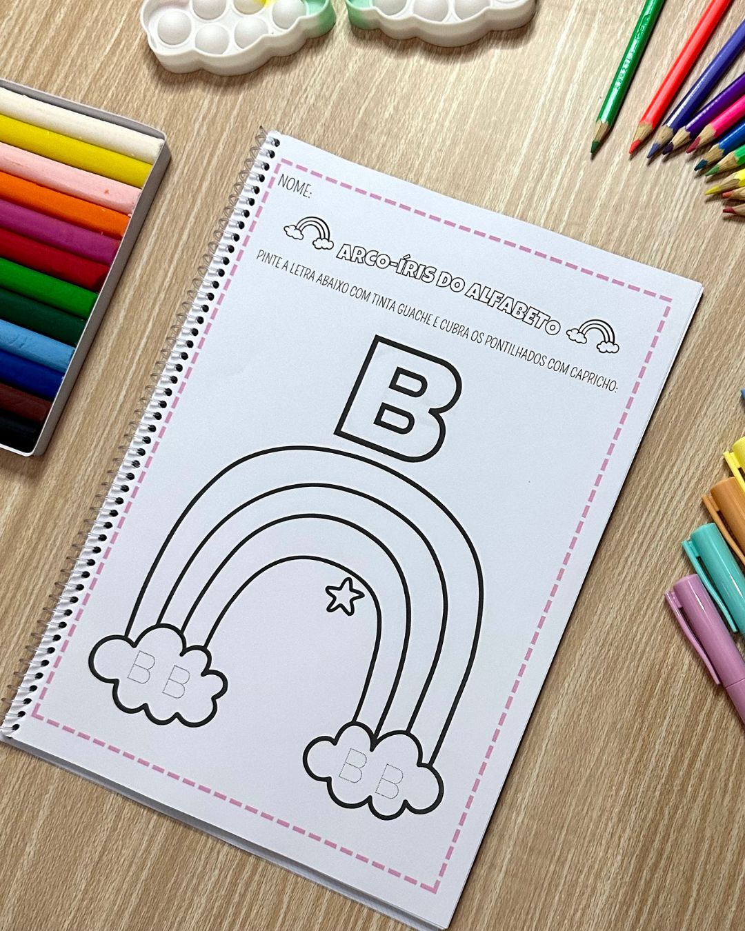 A apostila possui 26 páginas de atividades, com uma atividade para cada letra do alfabeto. No início da folha a sugestão é colorir a letra e, destaque com tinta guache. Logo abaixo a criança poderá fazer criações artísticas no arco-íris e realizar o traçado da letra com diferentes materiais, como tinta e cotonete, canetinha, lápis de colorir ou giz de cera. Para complementar a mediação podemos trabalhar com a representação sonora da letra, e oralmente citar palavras que iniciam com essa letra.