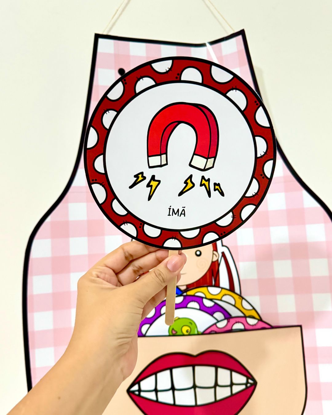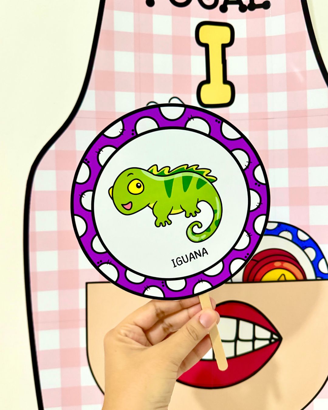 Desenvolve consciência Fonológica, pois o bolsinho possui a ilustração da boca que representa o som da vogal.