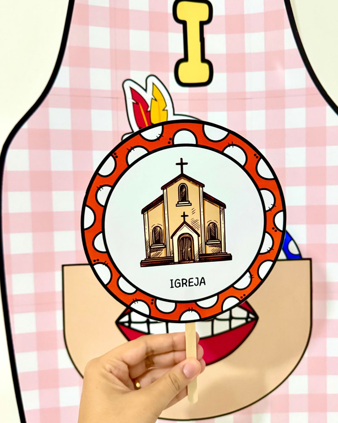 O material vai ampliado e inclui o avental (adulto) e 7 cards ilustrados de figuras que iniciam com a letra.