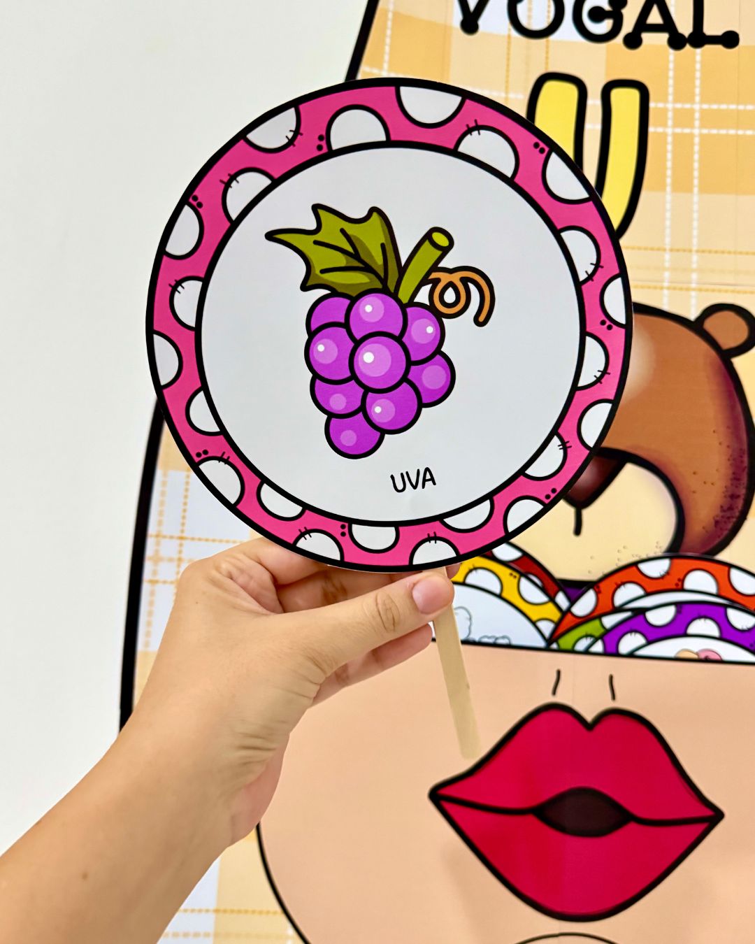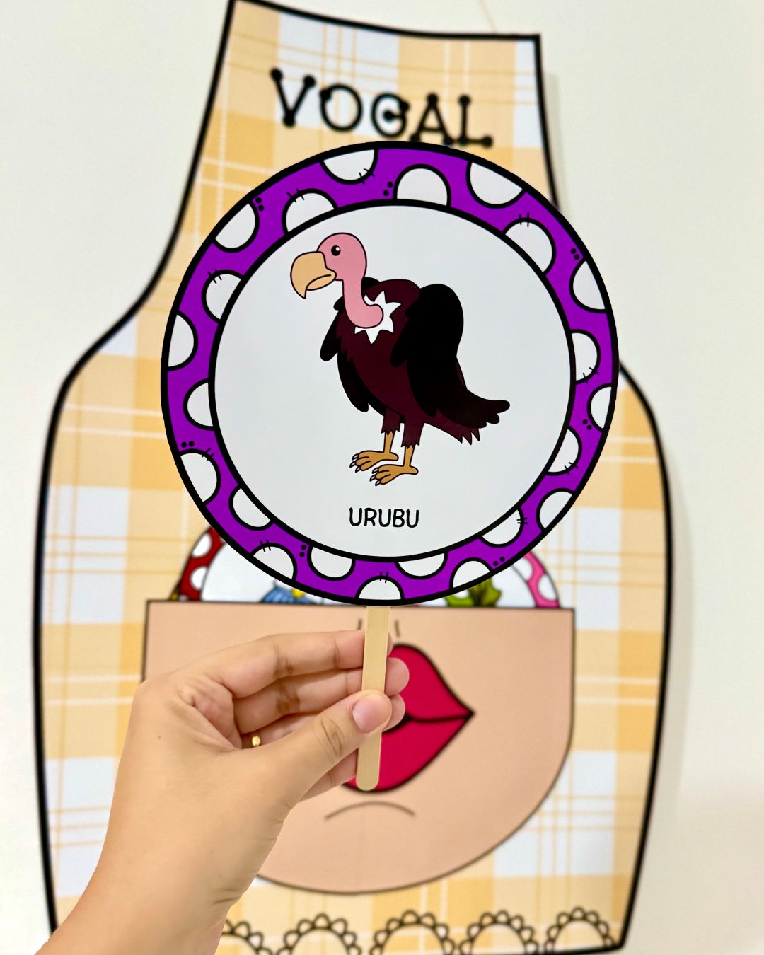 Desenvolve consciência Fonológica, pois o bolsinho possui a ilustração da boca que representa o som da vogal.