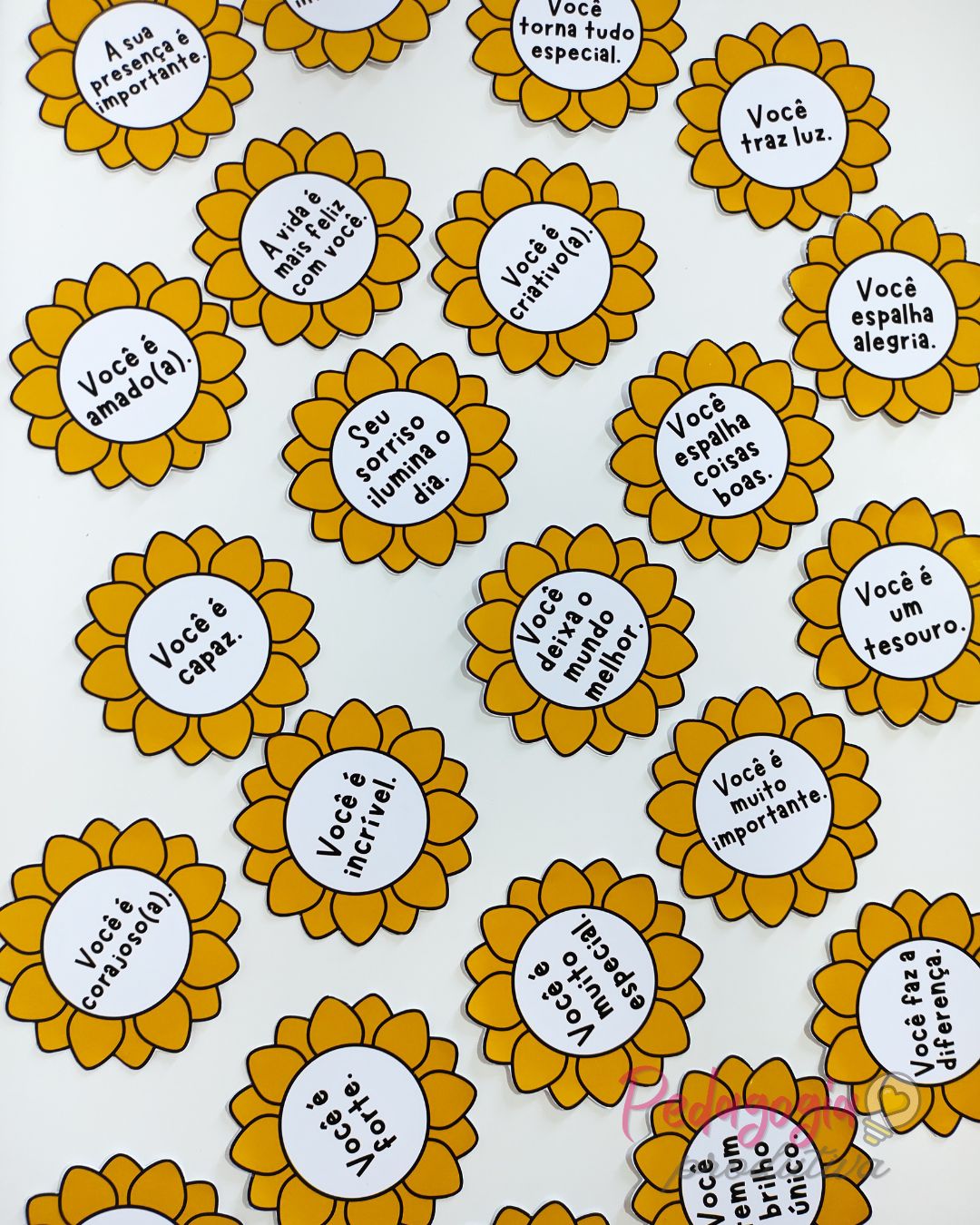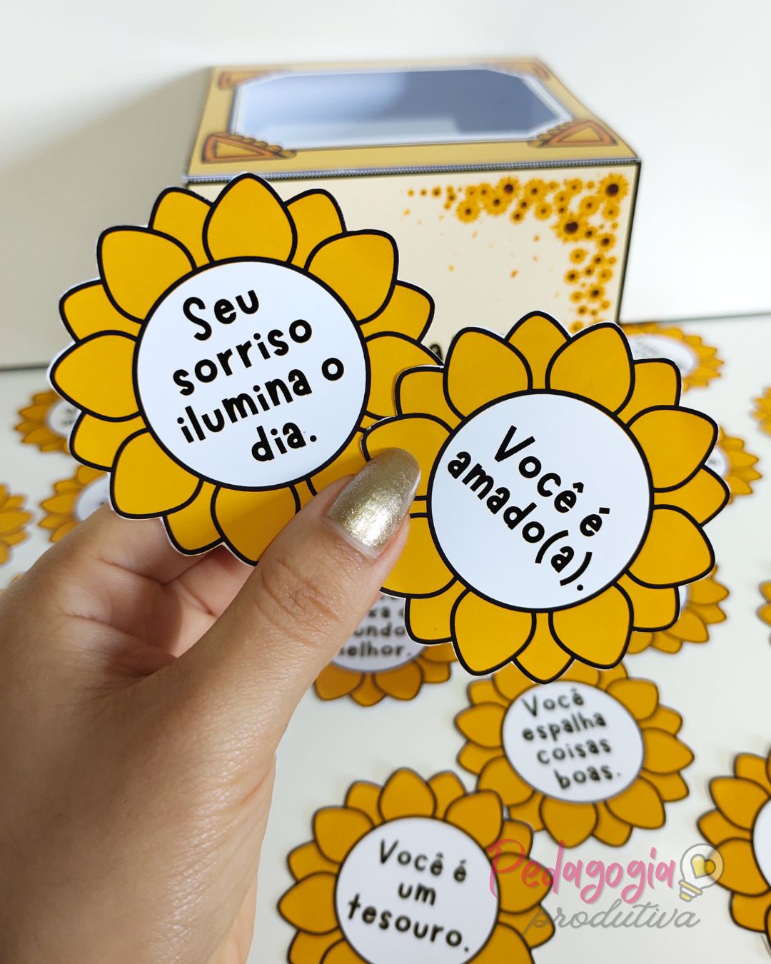 Pode ser utilizada de duas maneiras: as crianças retiram fichas em formato de girassol com frases curtas e positivas e entregam para um colega, ou cada criança escolhe sua própria ficha para levar para casa.