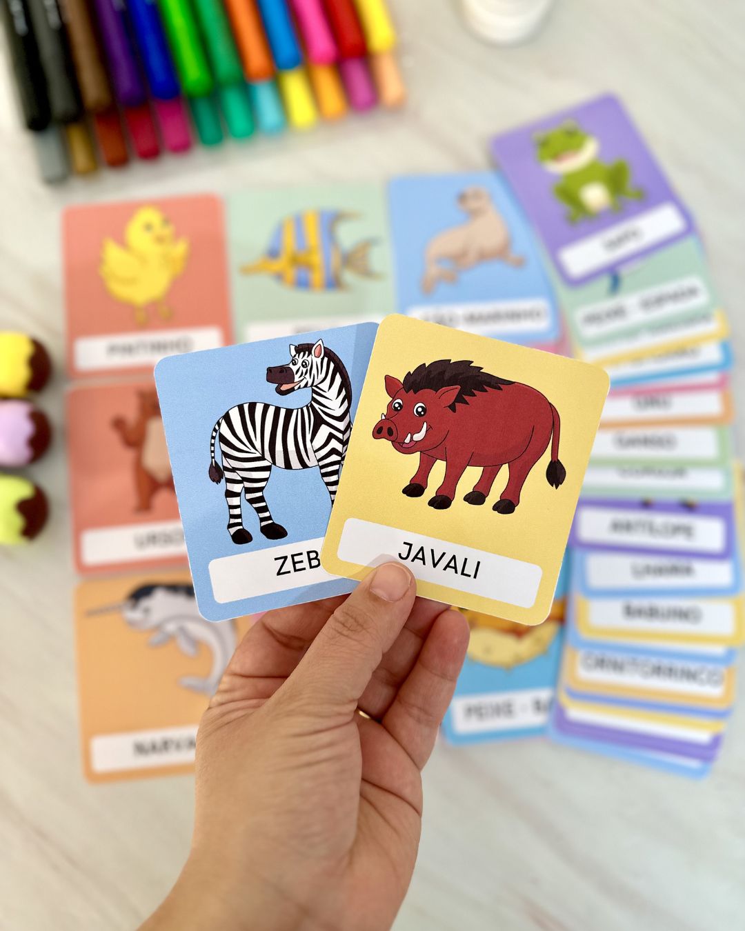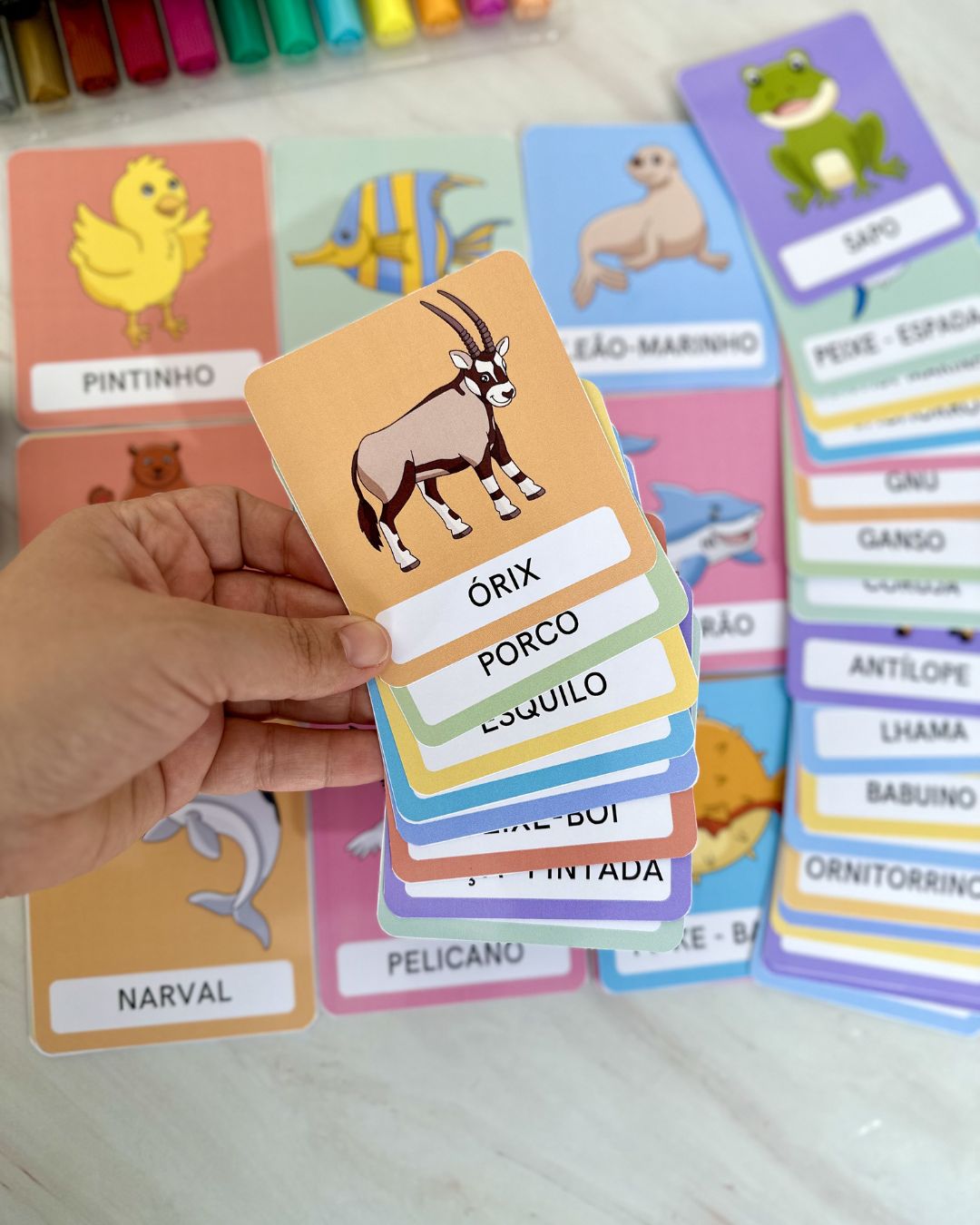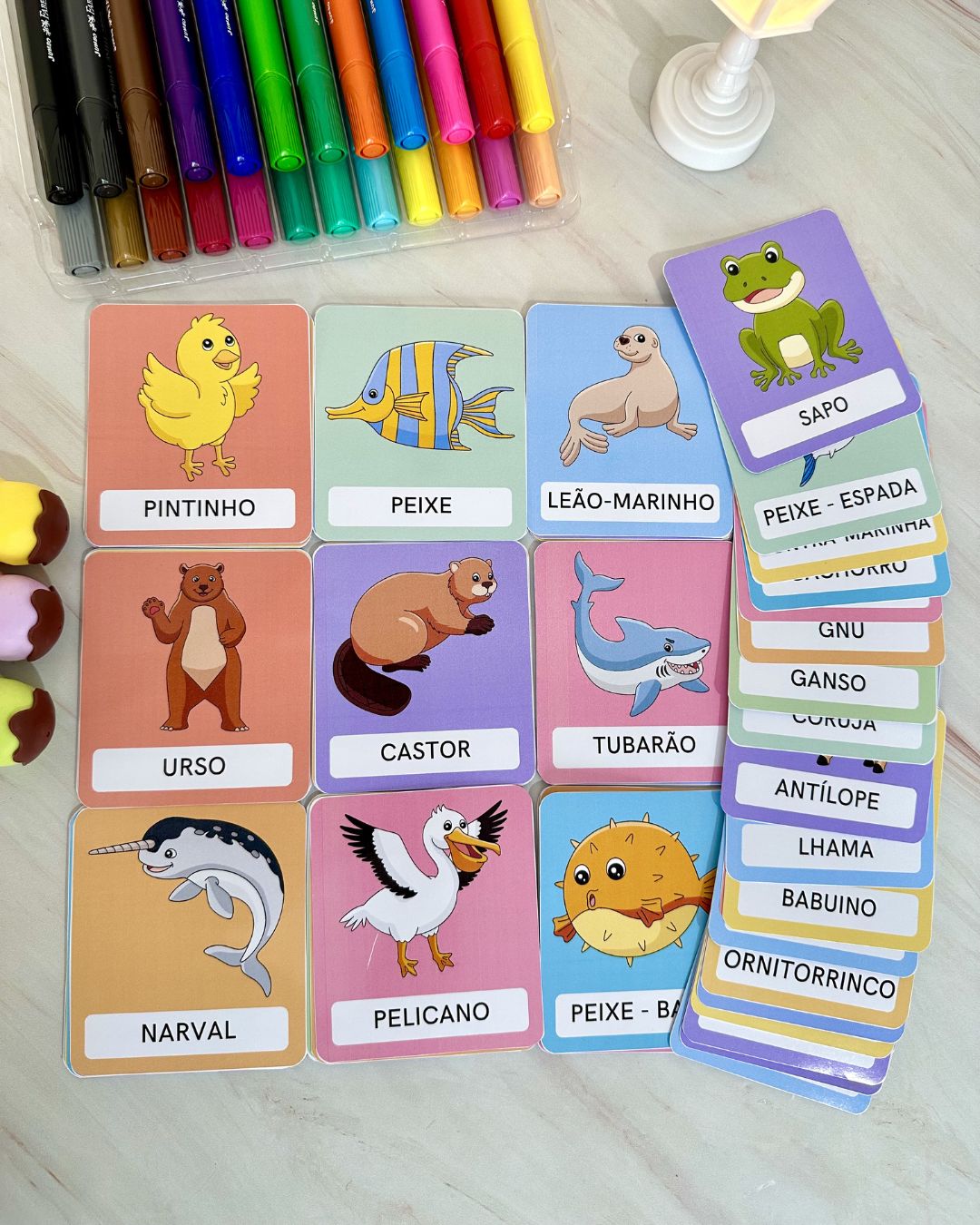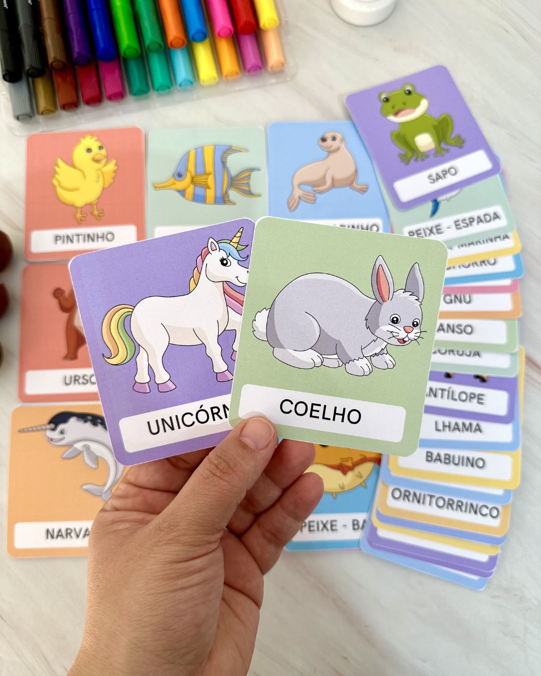 Com ilustrações coloridas e atrativas, os cards ajudam as crianças a associar cada animal ao seu respectivo nome, promovendo o desenvolvimento cognitivo, linguístico e sensorial. É recomendado imprimir em papel fotográfico de gramatura 180.