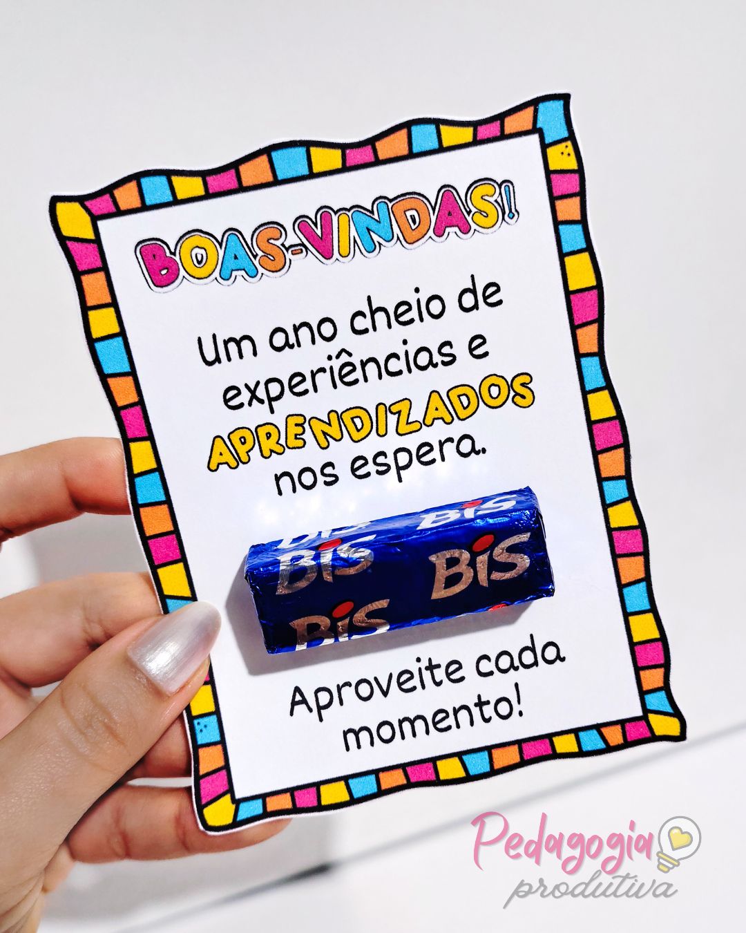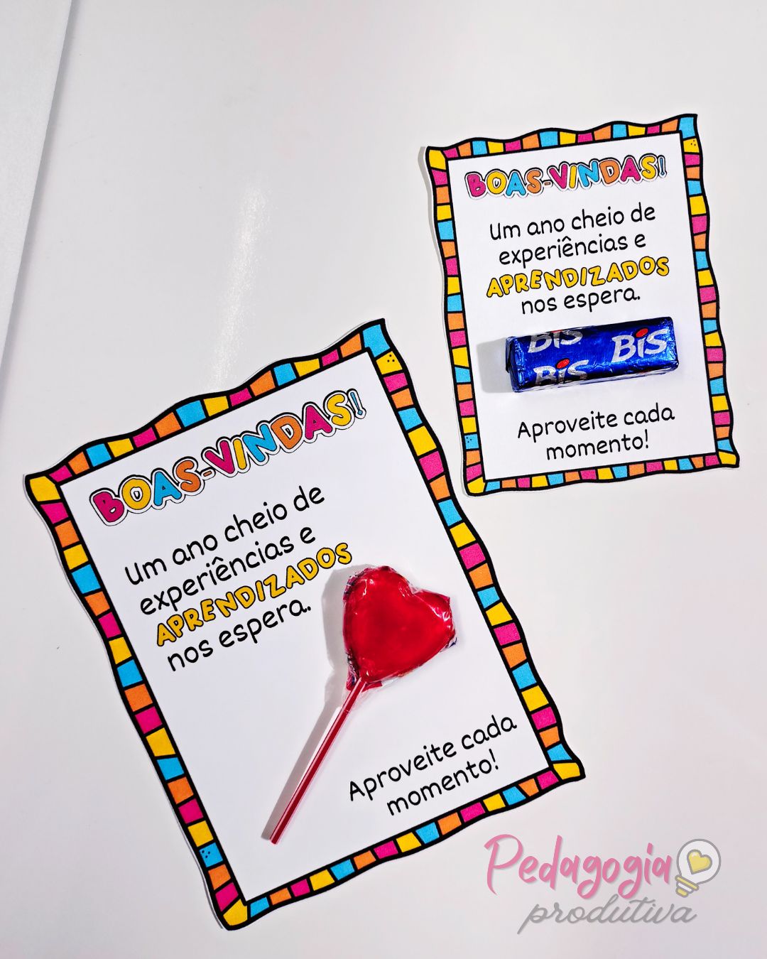 O material possui espaço para colocar chocolate ou pirulito, ideal para uma lembrancinha afetiva e significativa no primeiro dia de aula.