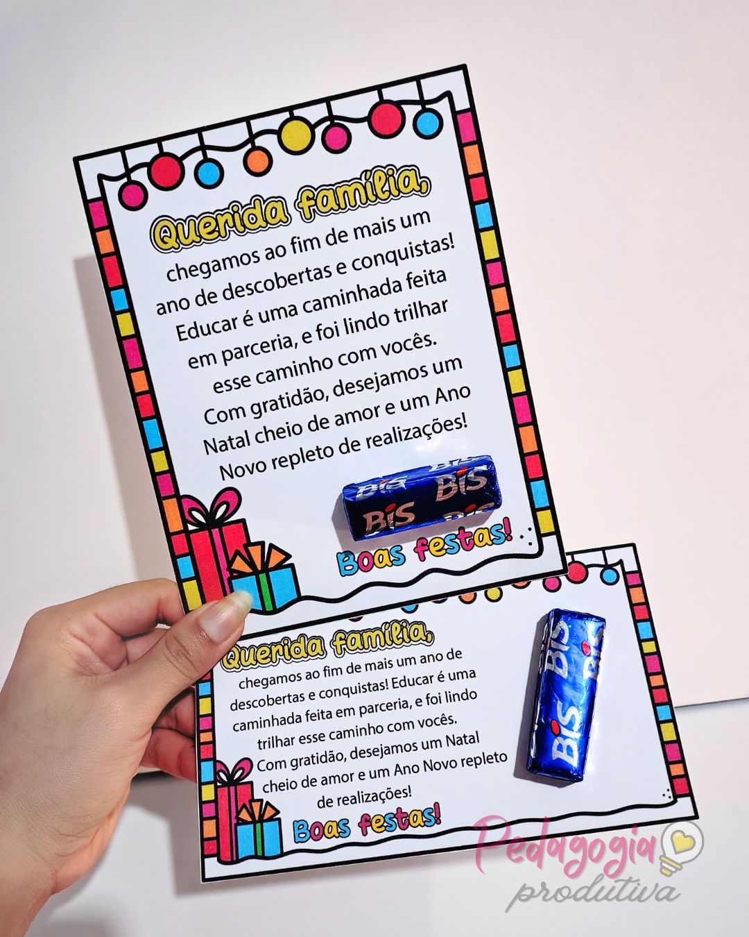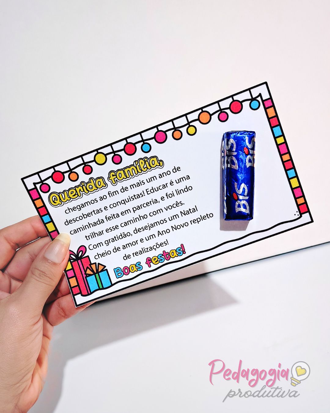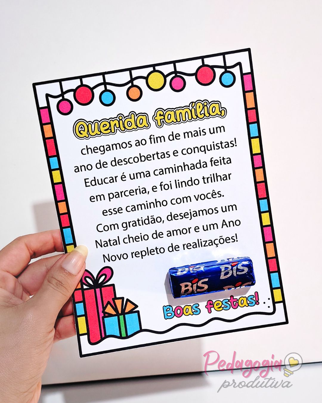 O Cartão “Querida Família – Boas Festas” é uma opção carinhosa para encerrar o ano letivo e agradecer pela parceria das famílias.