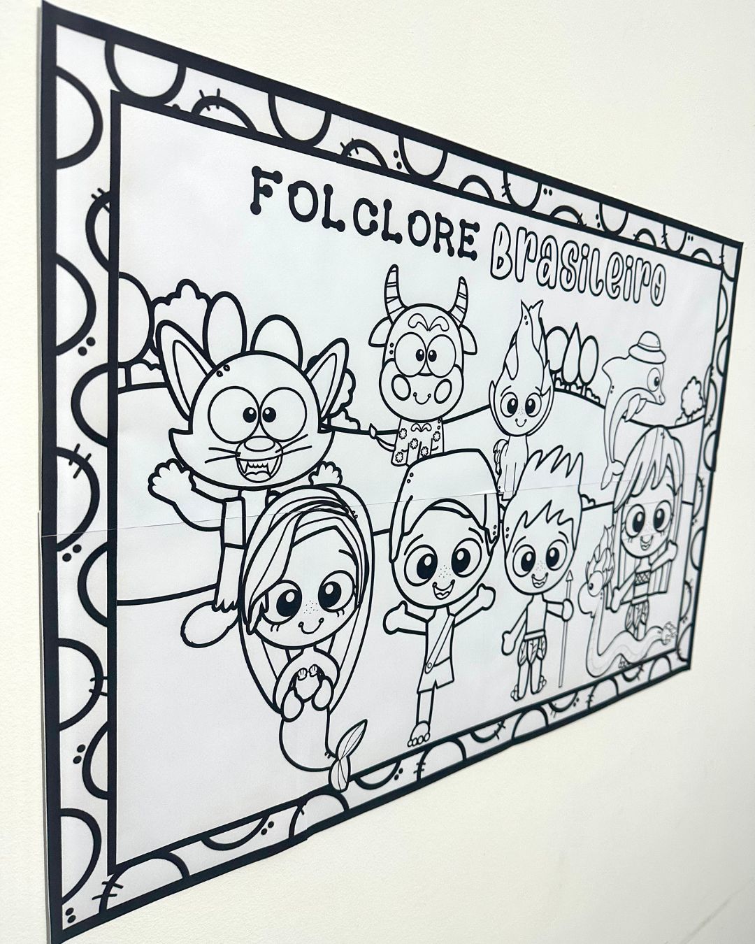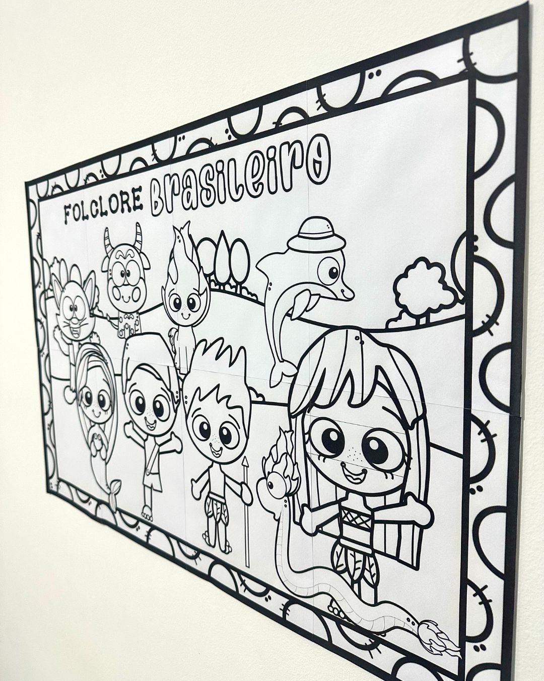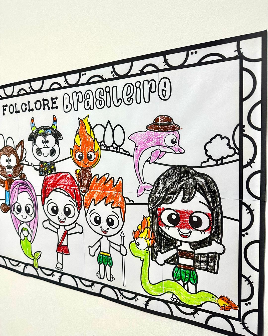 Cartaz para pintura coletiva tema Folclore Brasileiro com as principais lendas para as crianças colorirem em equipe.