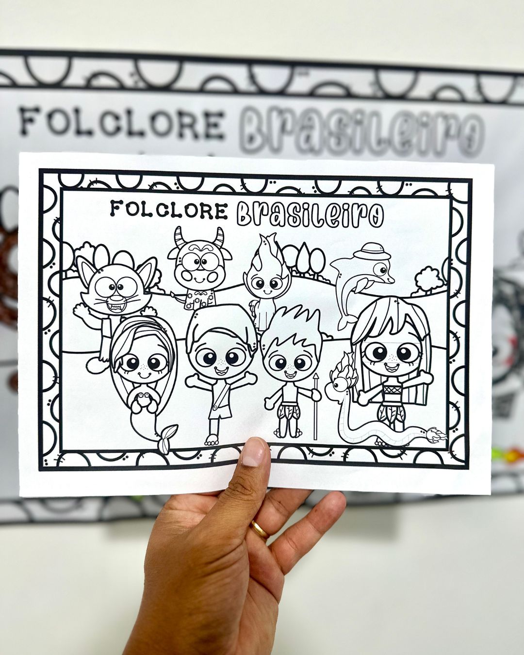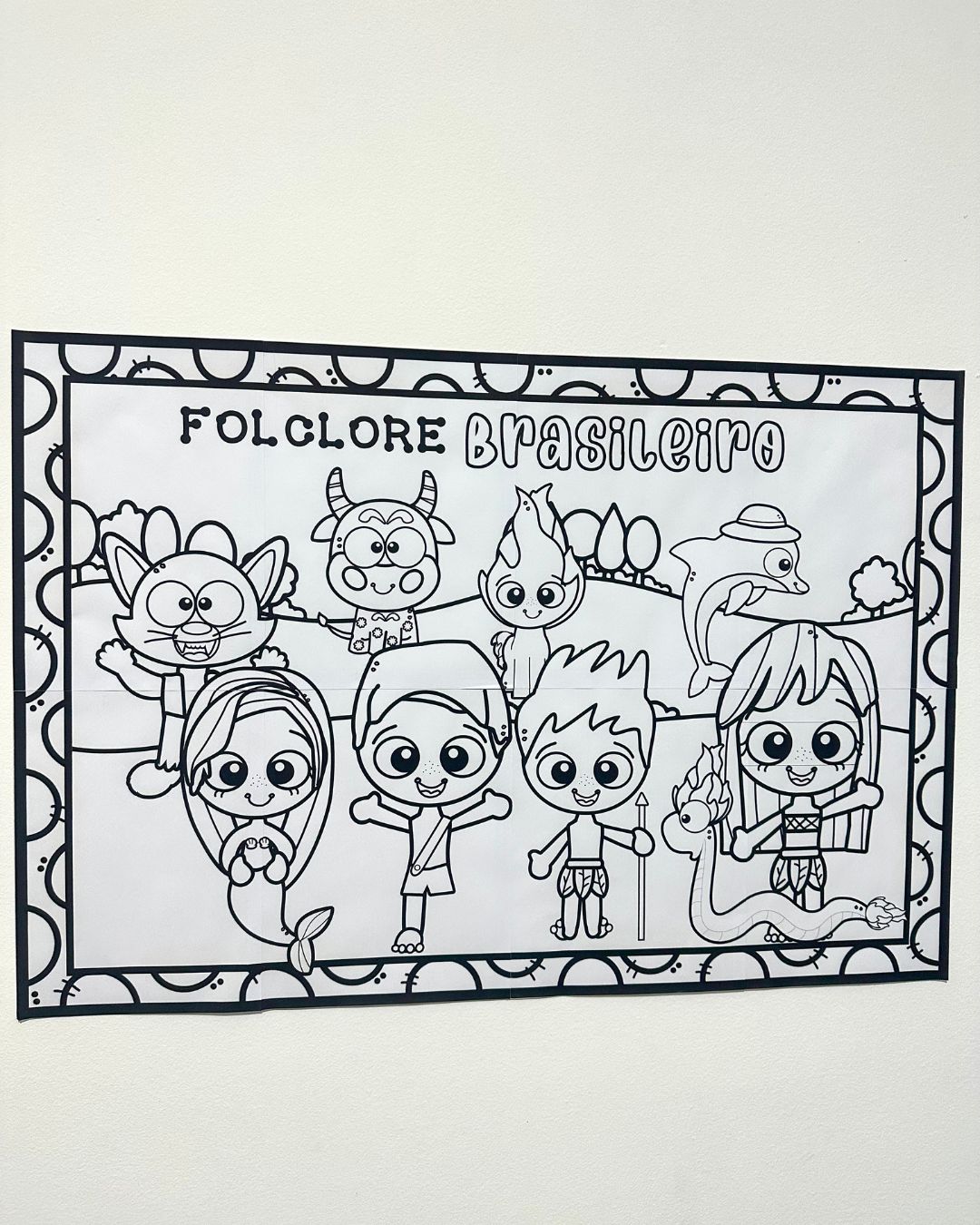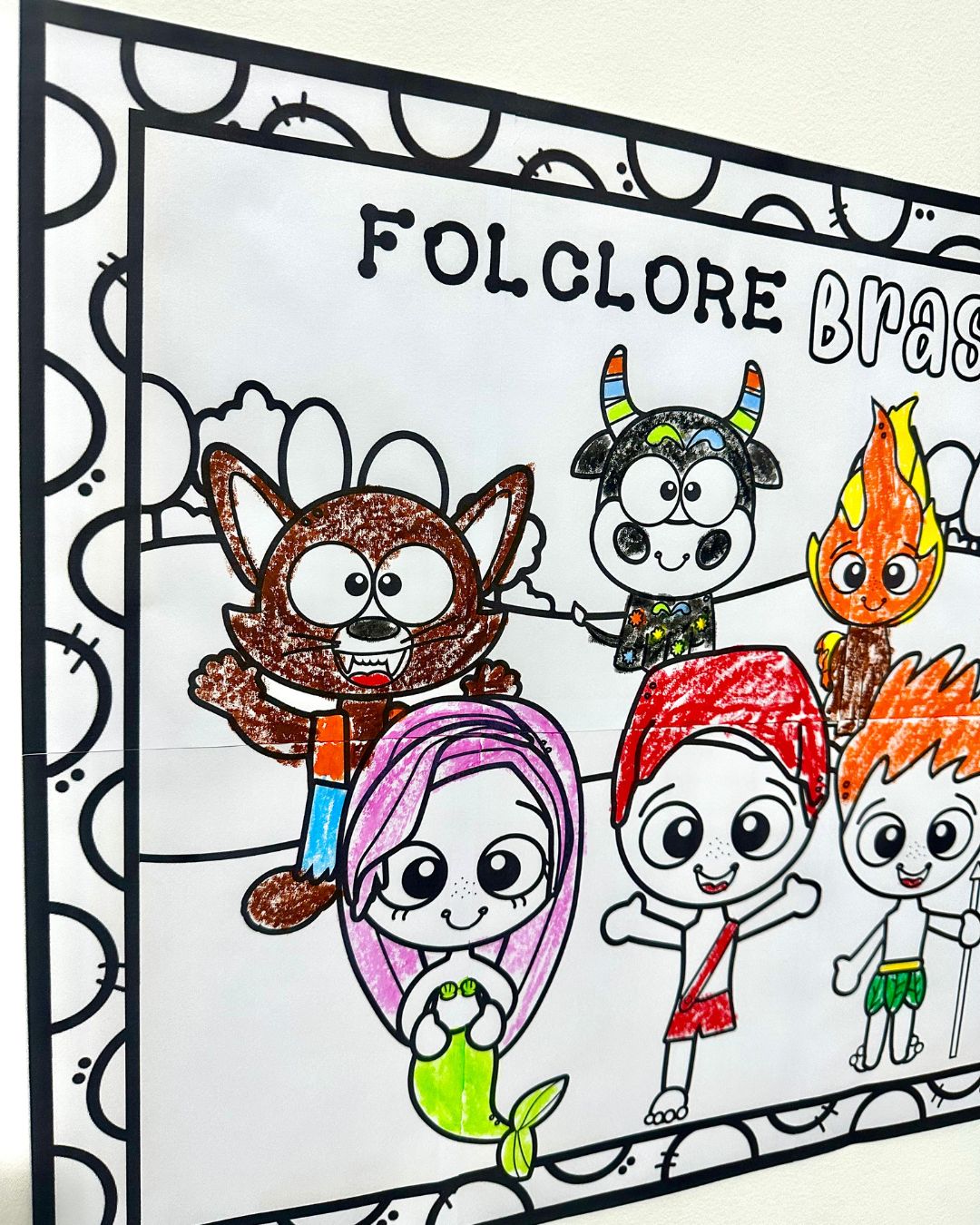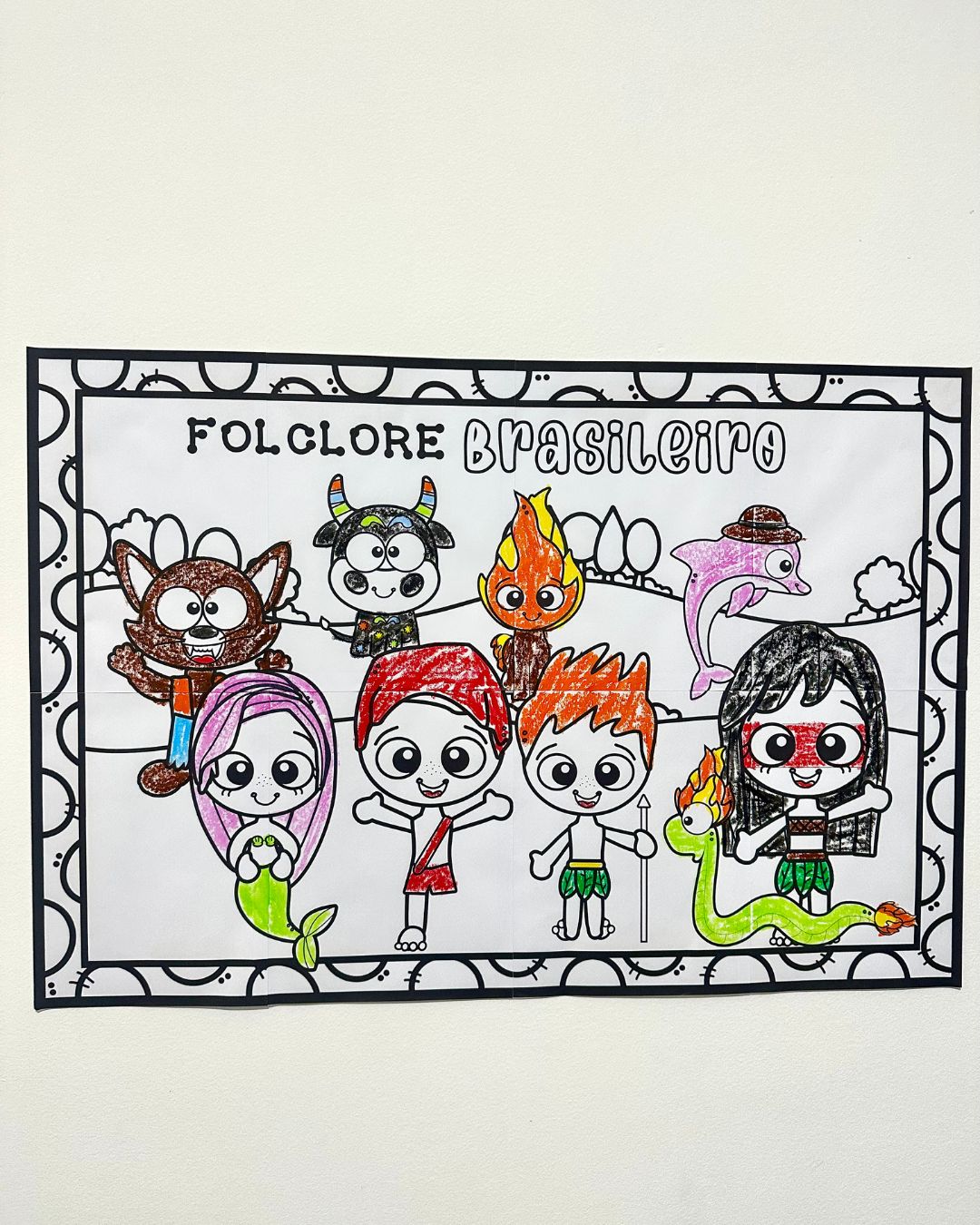 Cartaz para pintura coletiva tema Folclore Brasileiro com as principais lendas para as crianças colorirem em equipe.