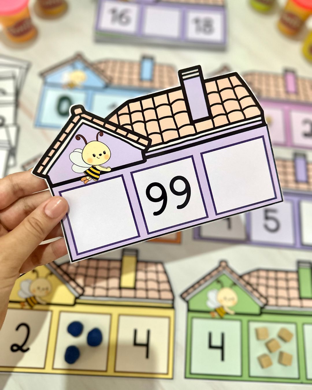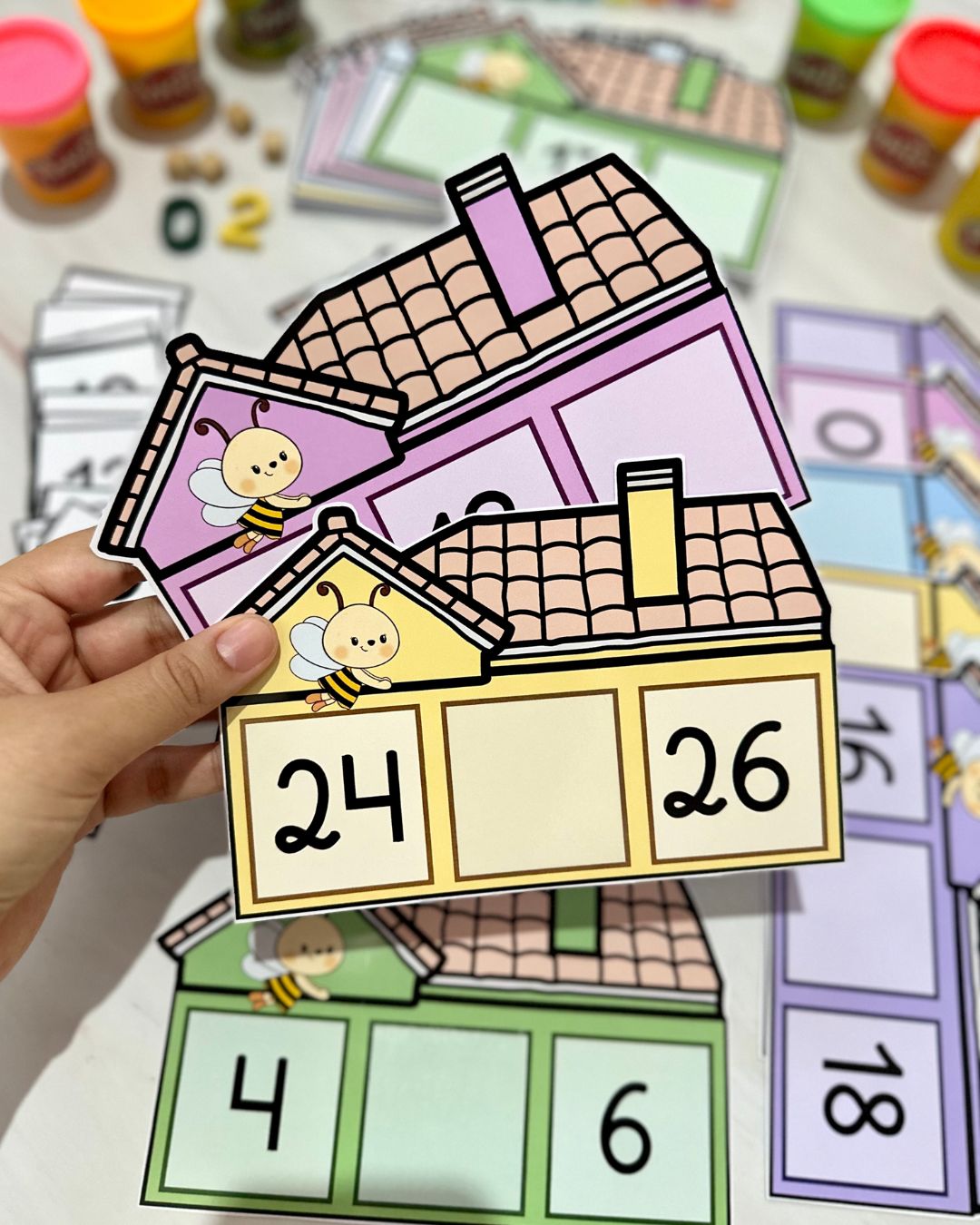 Arquivo Casinha dos Números para trabalhar sequência numérica com crianças a partir da educação infantil. Material com 100 fichas para completar a sequência, que trabalha com os numerais de 0 a 100.