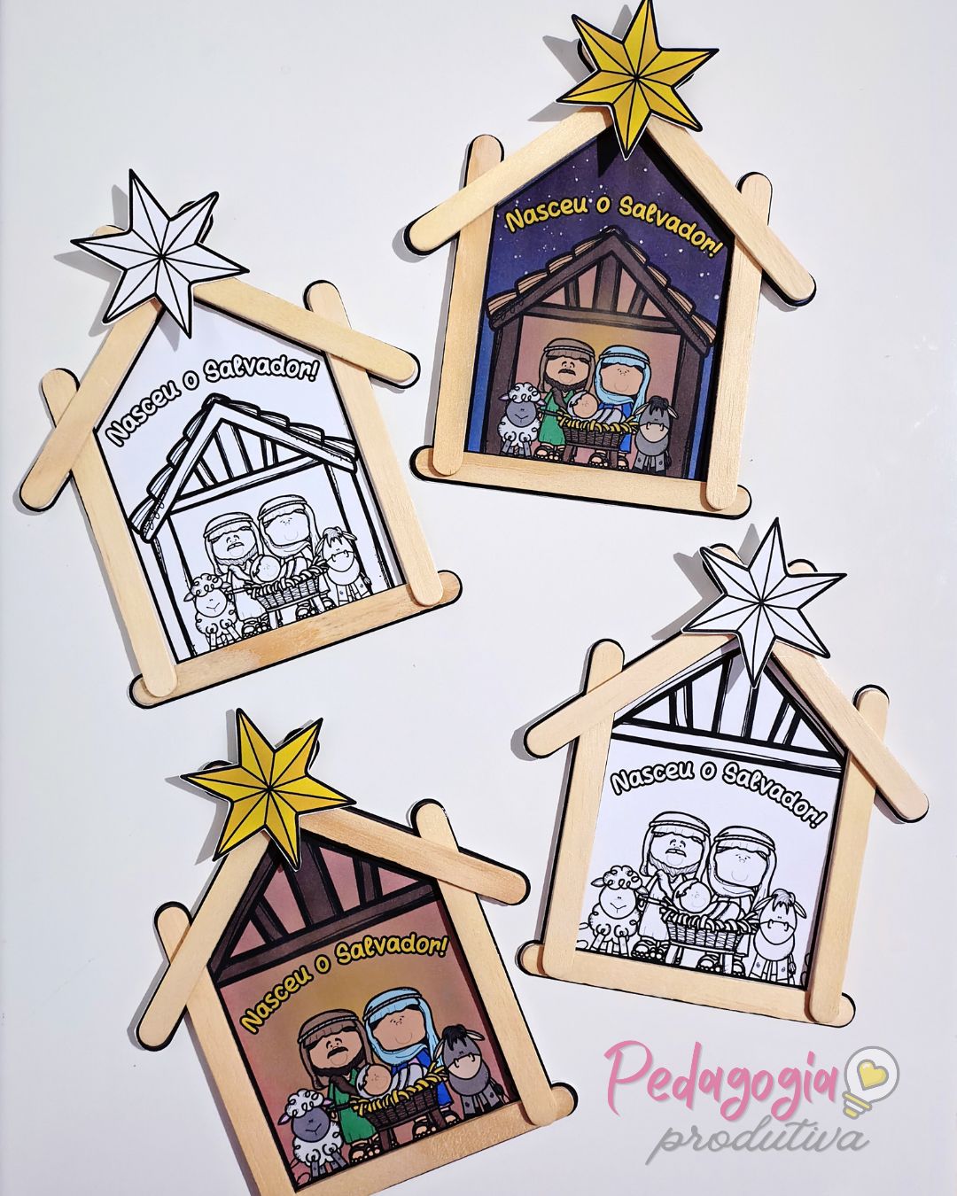 A proposta é simples e encantadora: as crianças colam palitos de picolé, recortam e colam a estrela, formando um lindo cenário natalino.