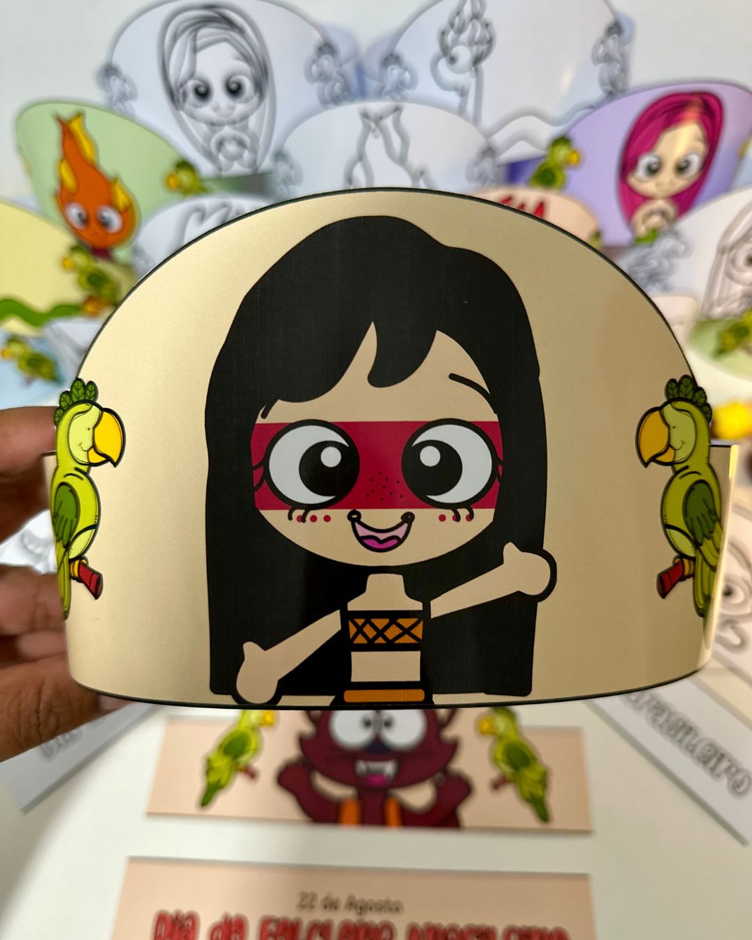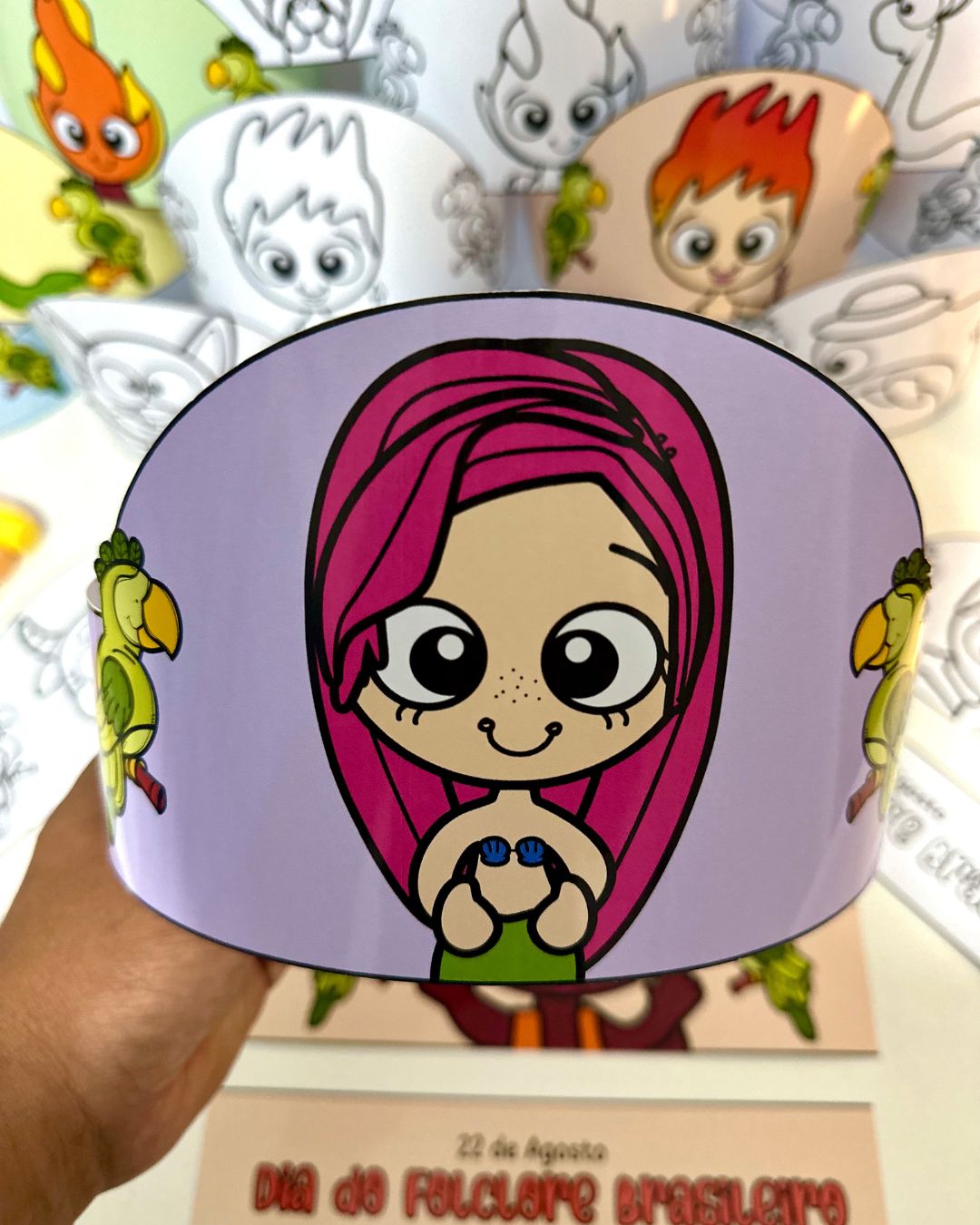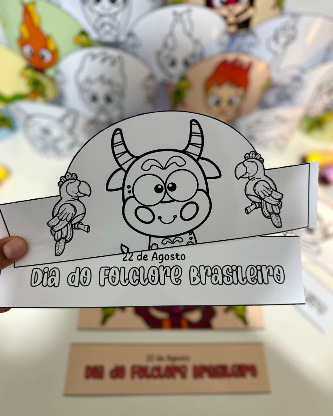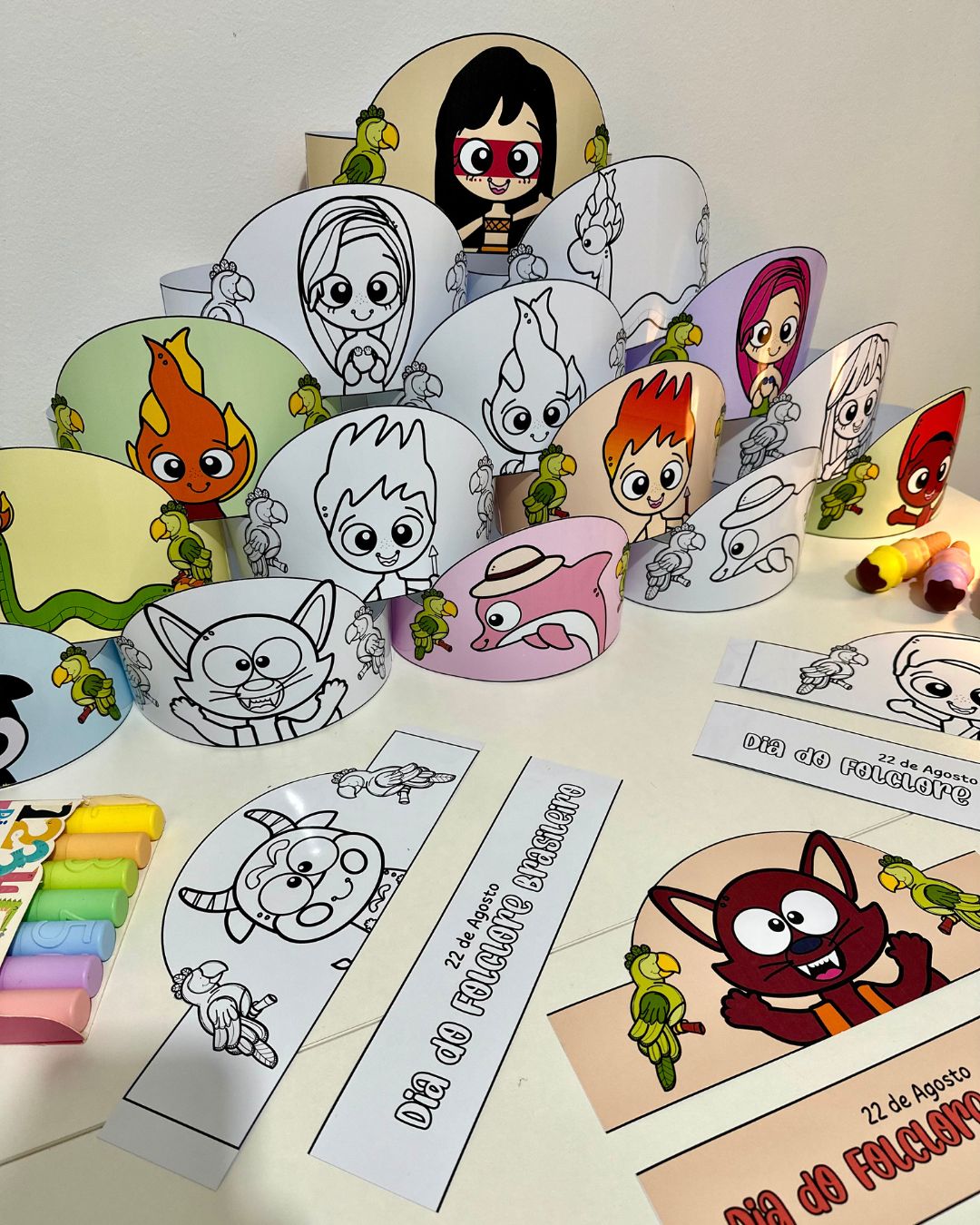 Vai com 9 coroas coloridas e 9 coroas para colorir, e inclui os personagens das principais lendas do Folclore Brasileiro.