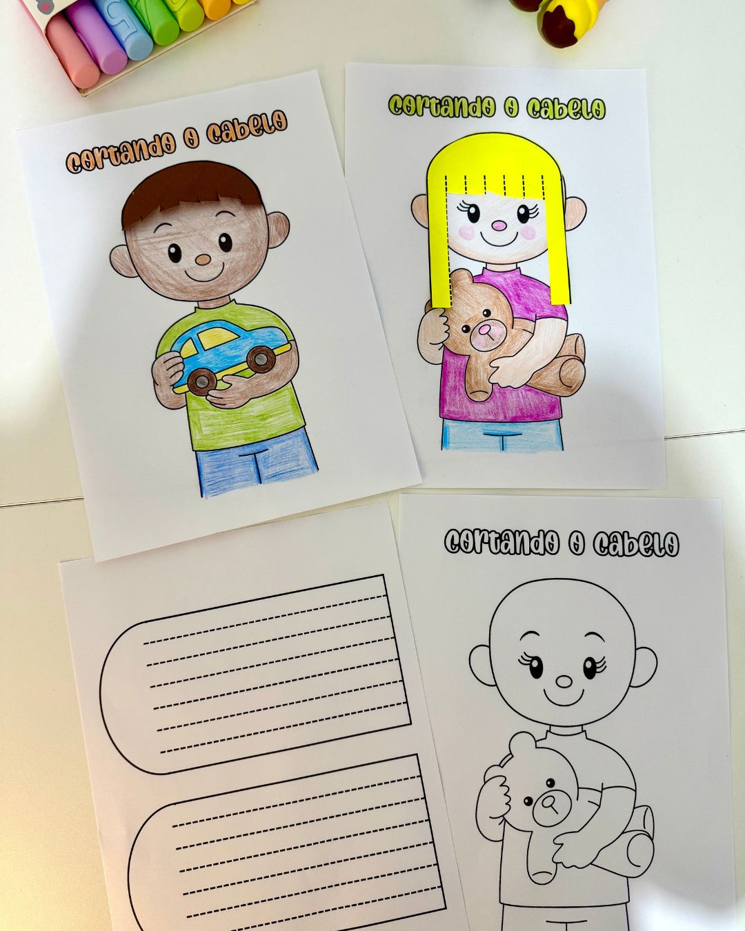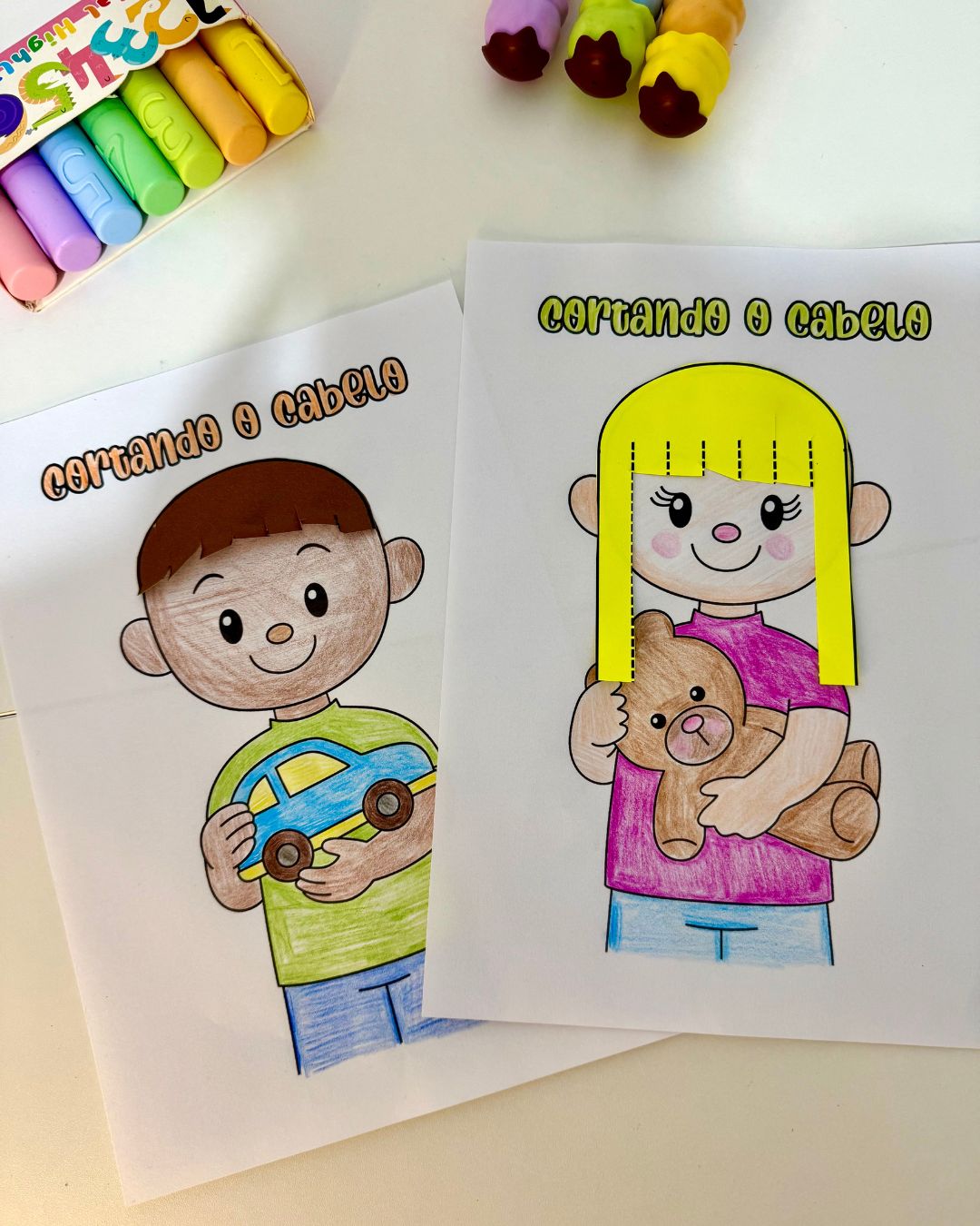 Nessa proposta a criança irá colorir as figuras, colar o cabelo e recortar corretamente.