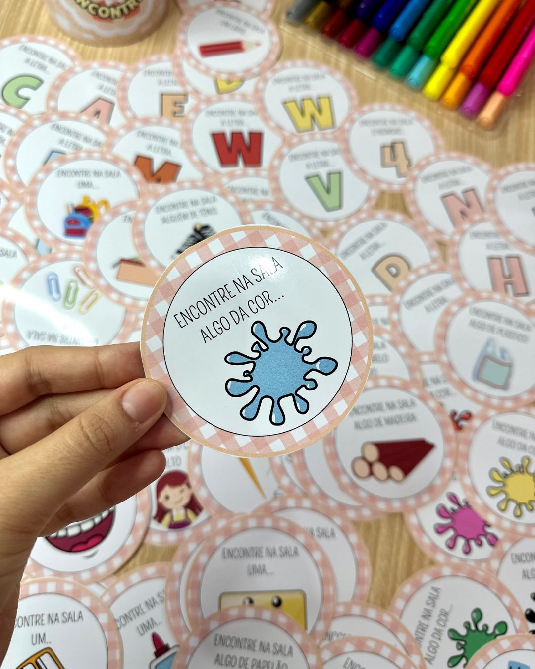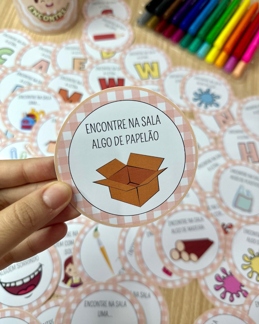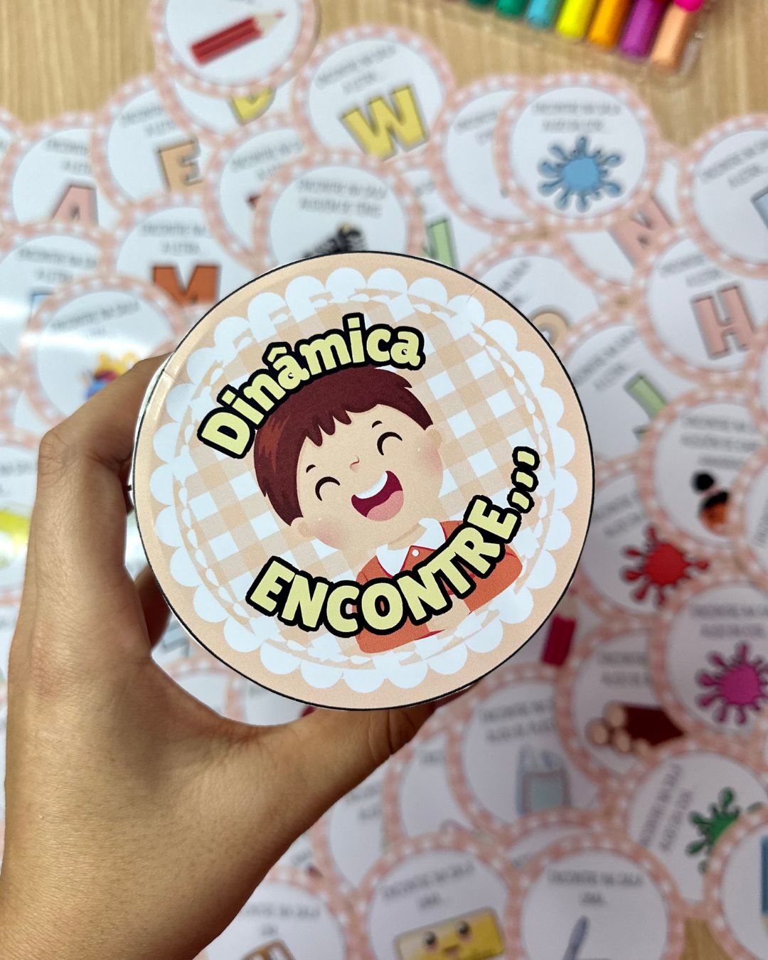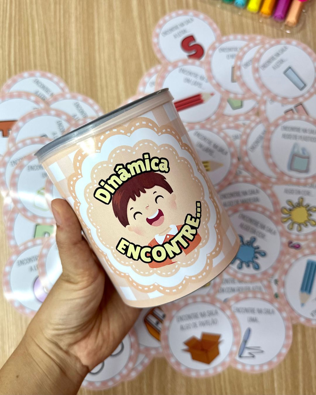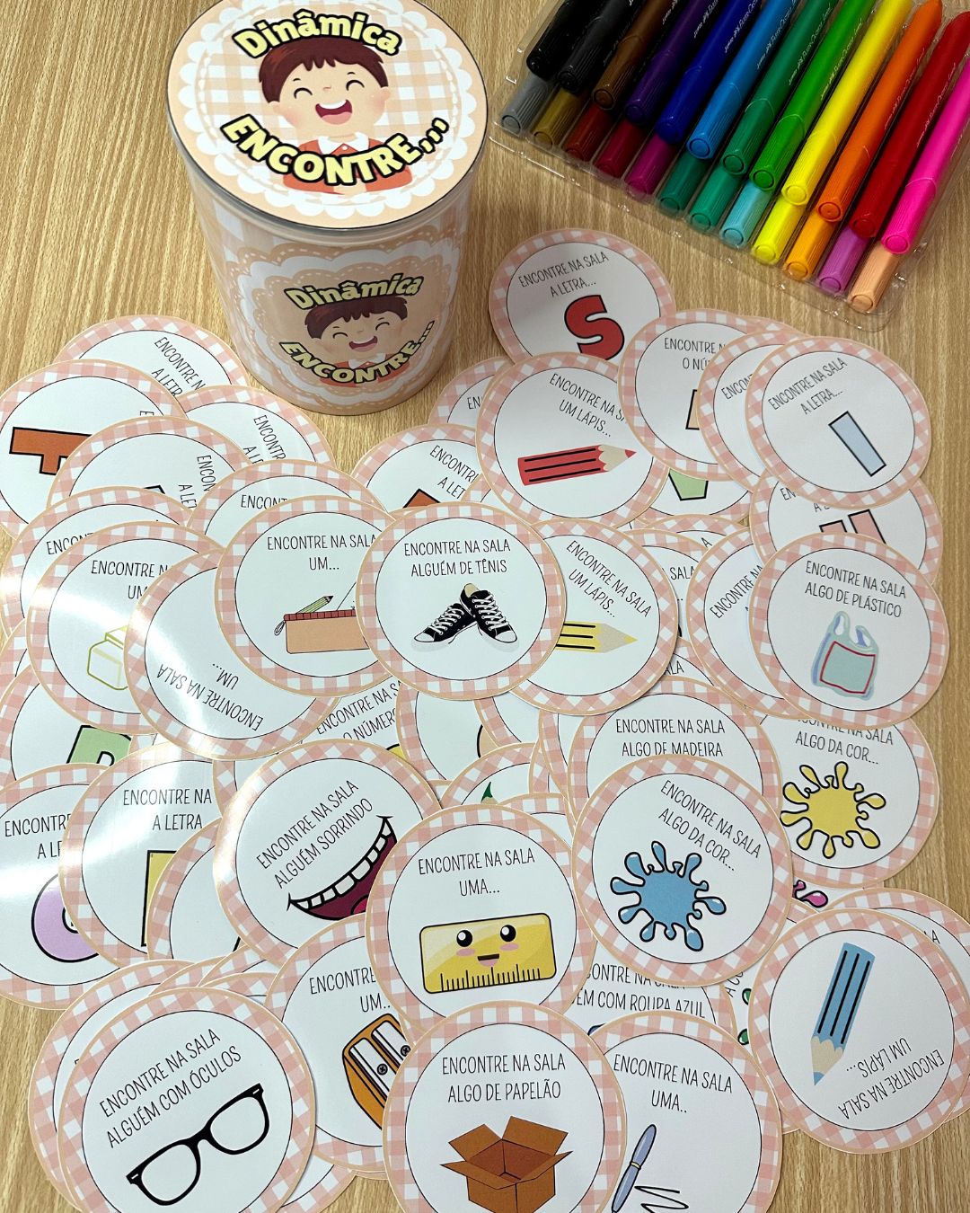 O arquivo Dinâmica “Encontre” inclui 72 fichas e a decoração de lata para a realização da brincadeira. A Dinâmica “Encontre” é uma proposta para ser realizada em sala de aula, em que as crianças deverão tirar uma ficha da lata e encontrar o objeto solicitado em até 10 segundos. Enquanto a criança procura as demais deverão realizar a contagem em voz alta. Caso a criança não consiga realizar o comando no tempo solicitado ela sairá da rodada. A ficha deverá retornar para a lata após ser tirada, e caso outra criança retire a mesma ficha, essa deverá encontrar um objeto diferente, não valendo o mesmo objeto já encontrado anteriormente. O jogo termina após restar apenas 1 participante, que será o ganhador da rodada.