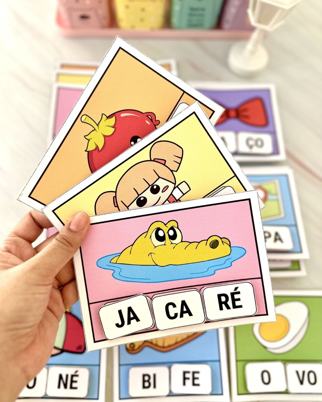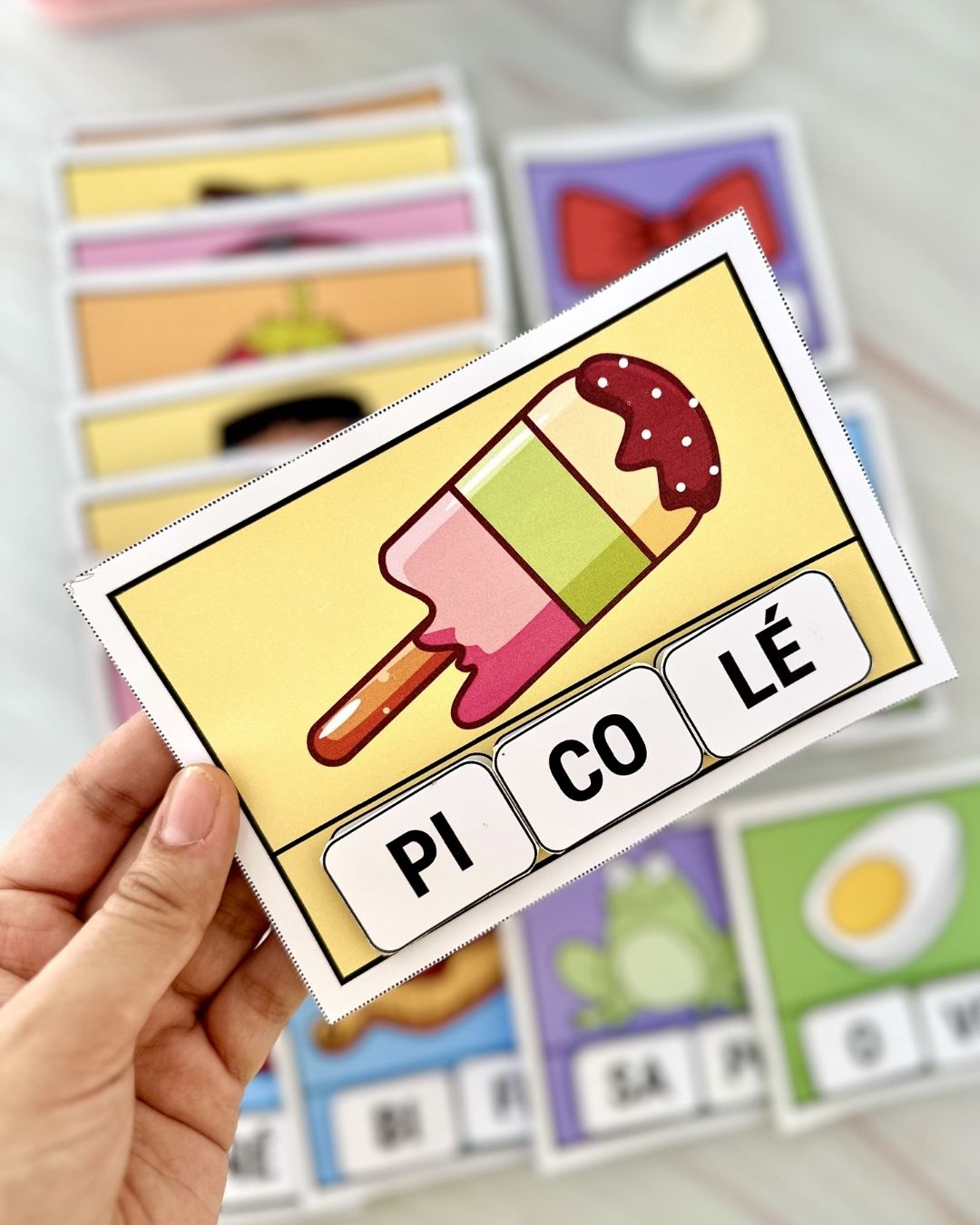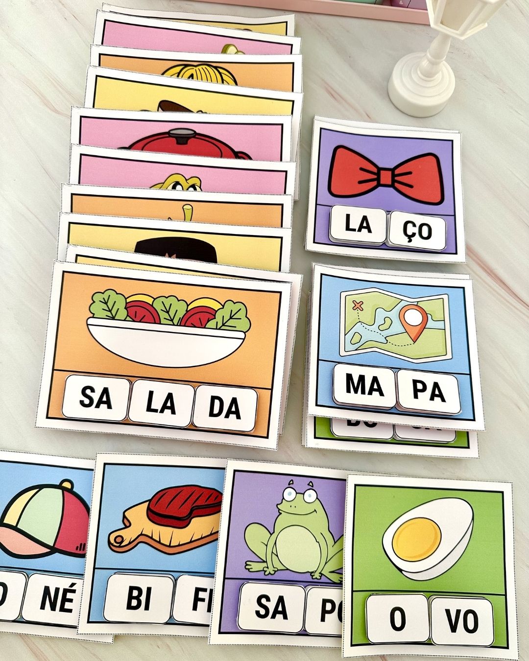 O material vai em PDF pronto para impressão, o recurso inclui 20 fichas com diferentes imagens e com sílabas móveis para a criança organizar as sílabas da acordo com a imagem.