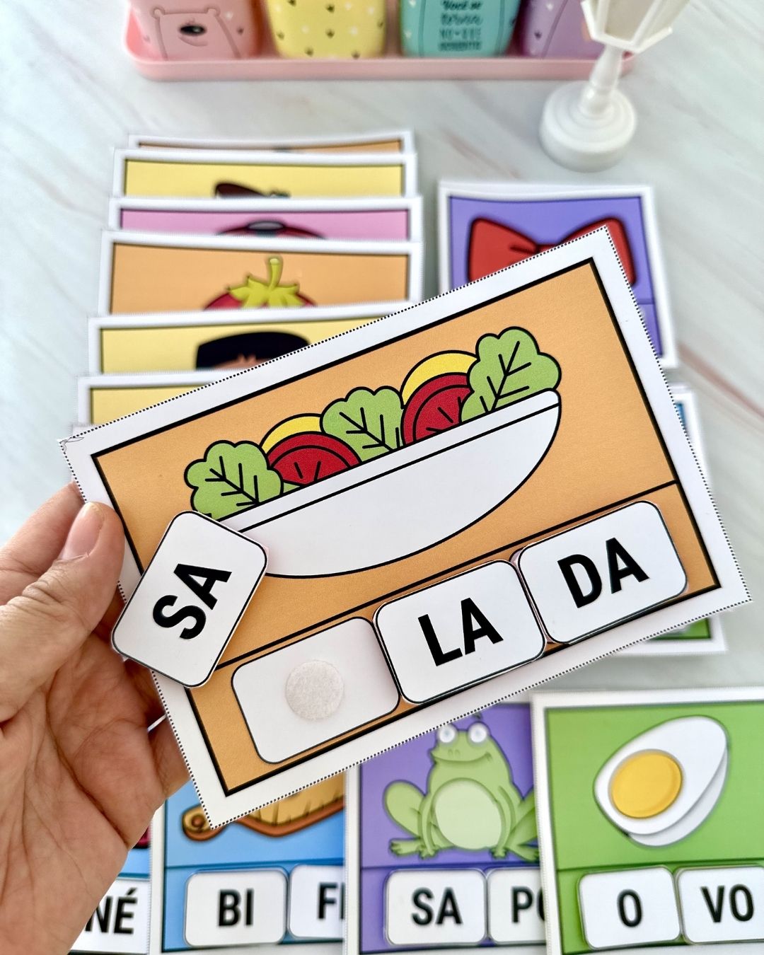 Para realizar a montagem do material, você pode utilizar velcro e EVA para colar as fichas.