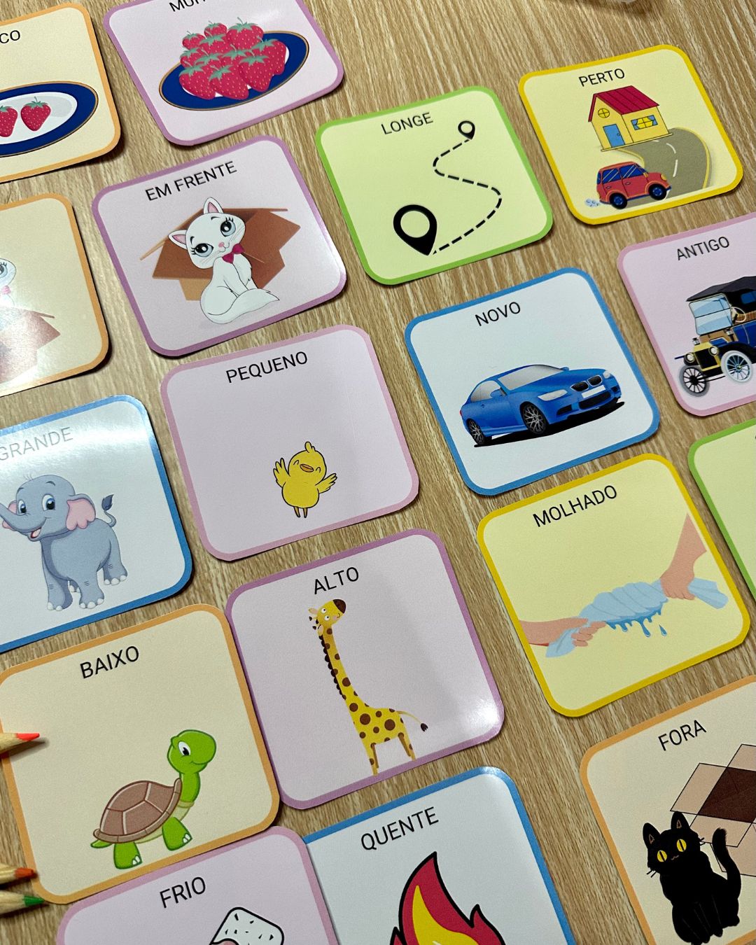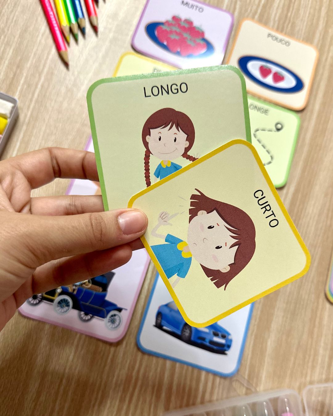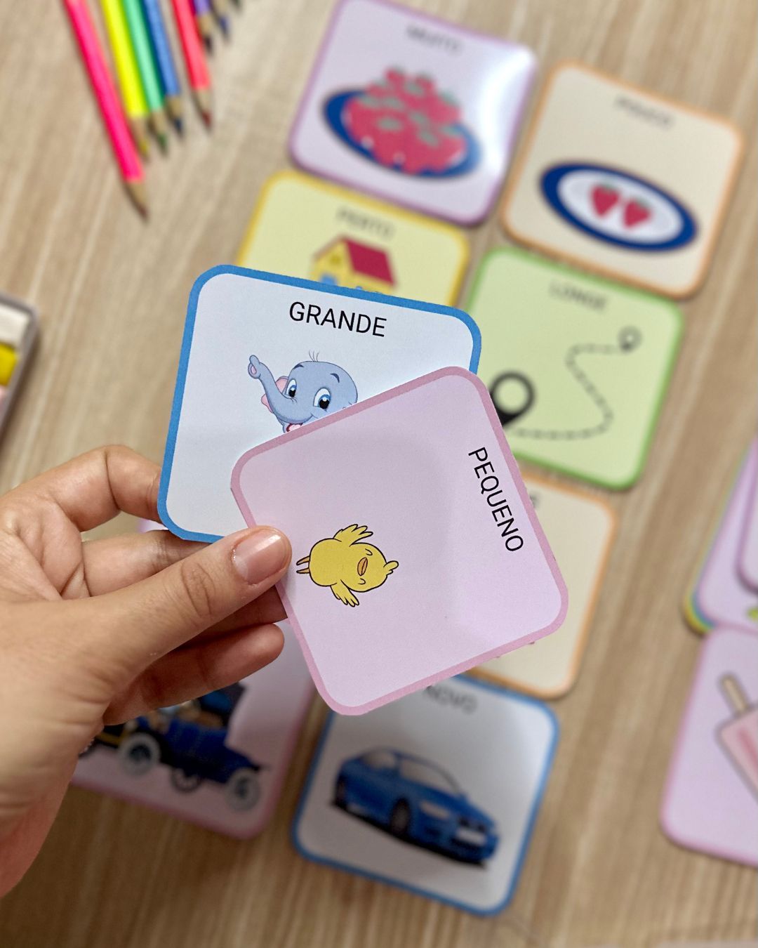 As cartas formam pares, e a busca pela carta correspondente estimula a criança a usar o raciocínio lógico e a percepção visual baseada na observação.