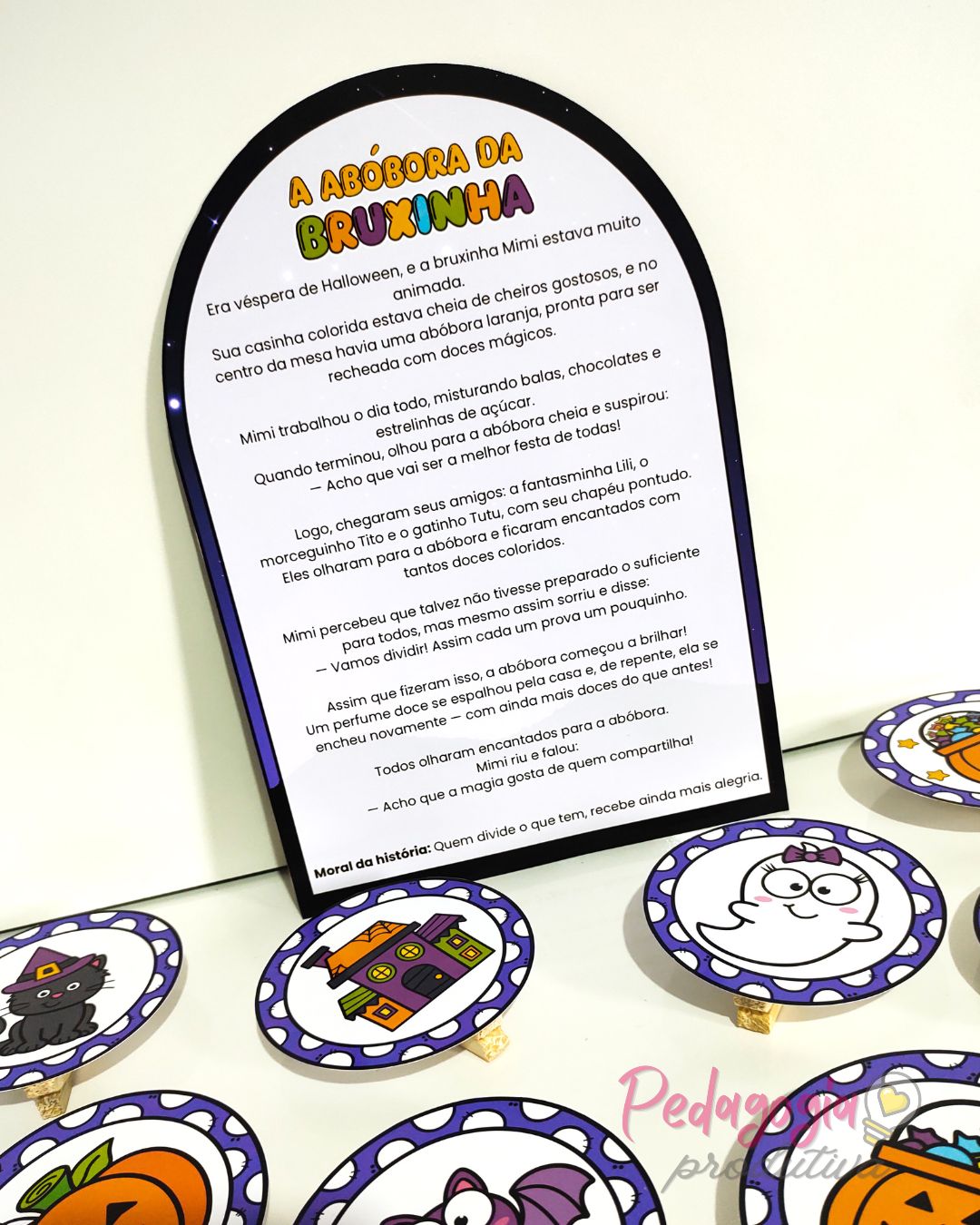 O material traz 8 cards ilustrados com os elementos da história e o texto completo no verso da luva, permitindo explorar a narrativa de maneira interativa e visual.