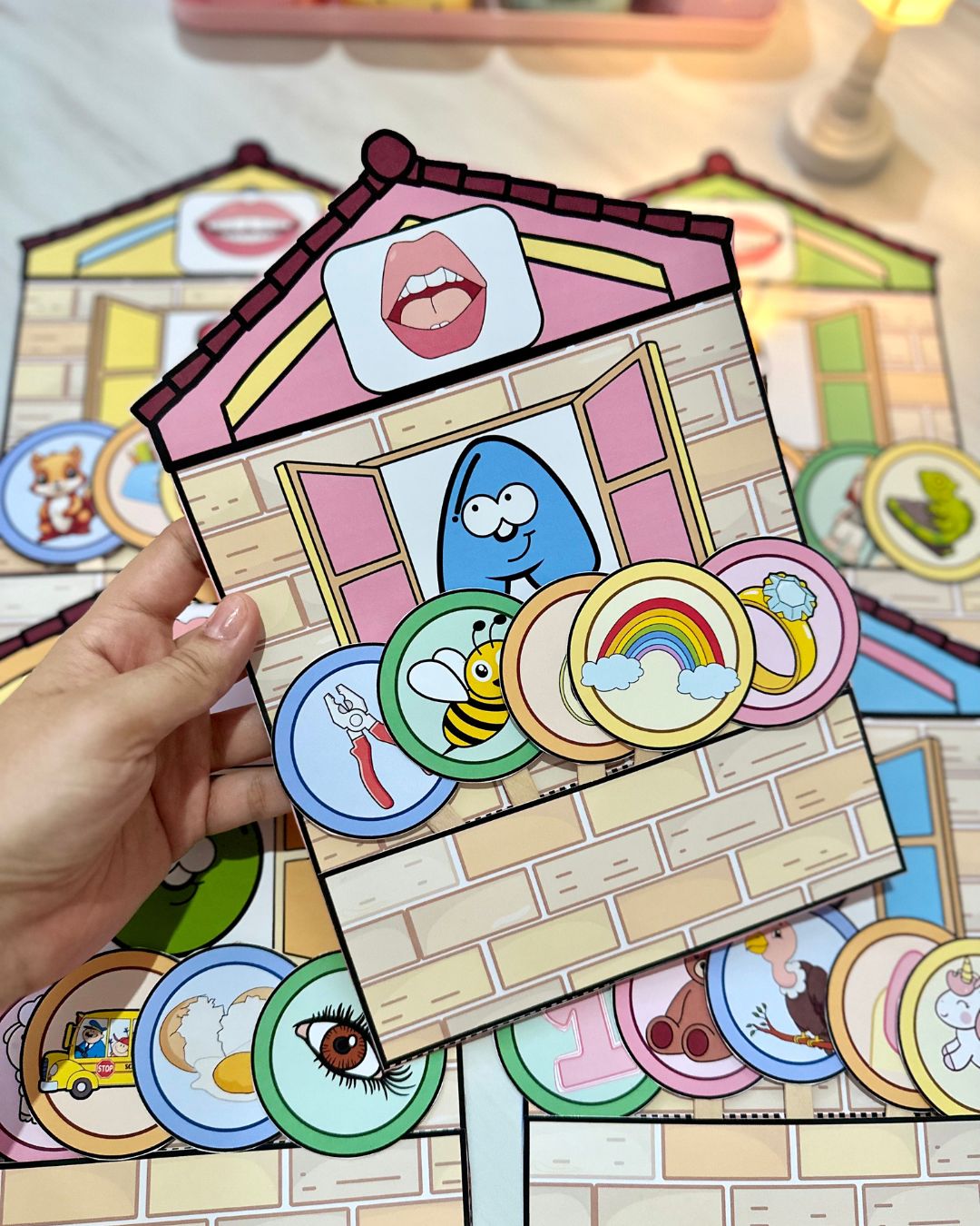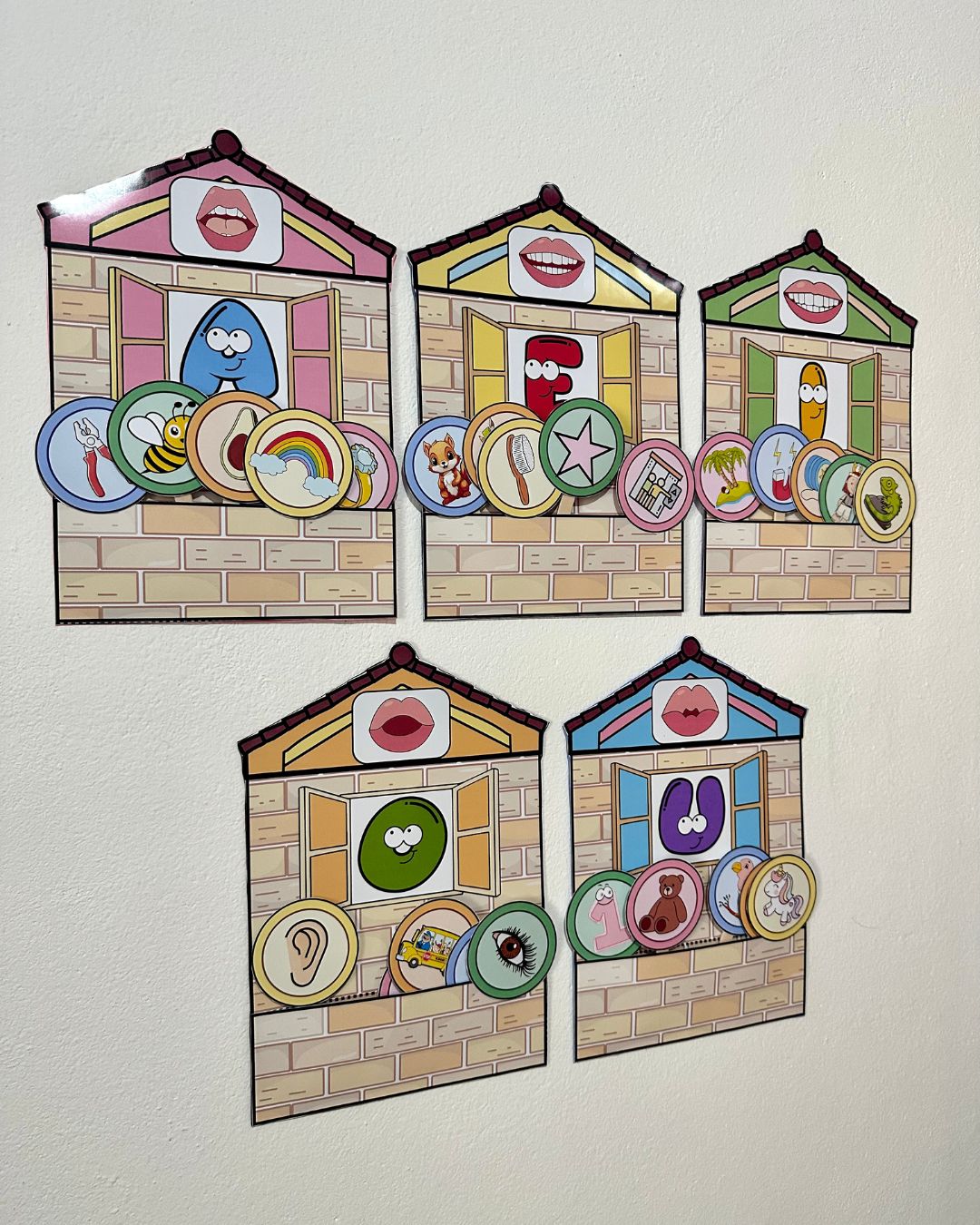 Material lindo para trabalhar todas as vogais, a casinha vai com as boquinhas fonoarticulatórias e com 5 figuras que iniciam com cada vogal.