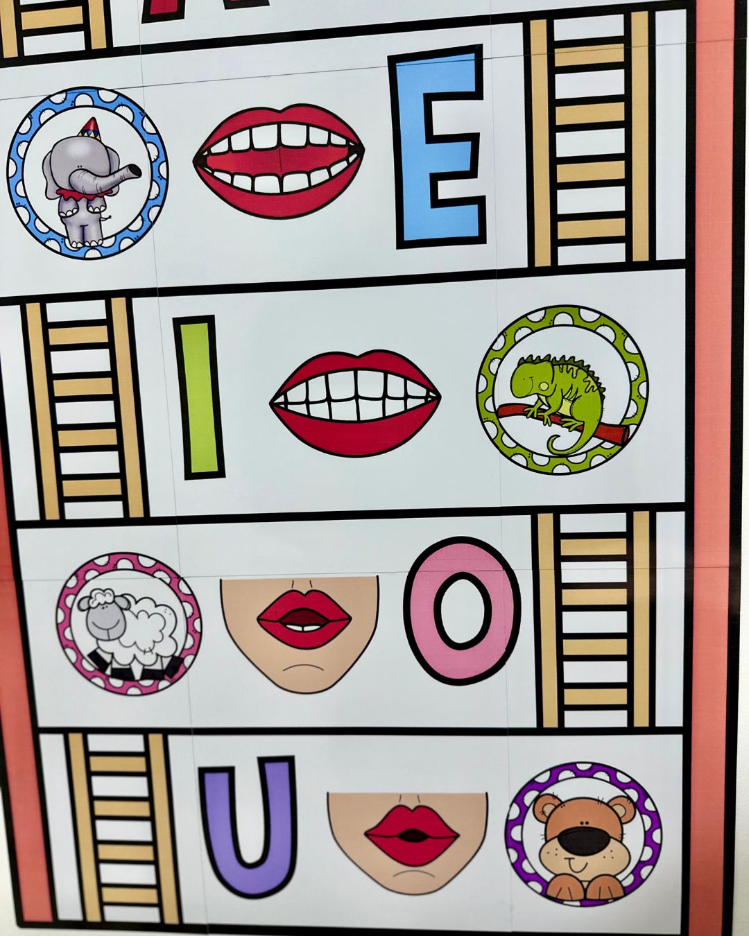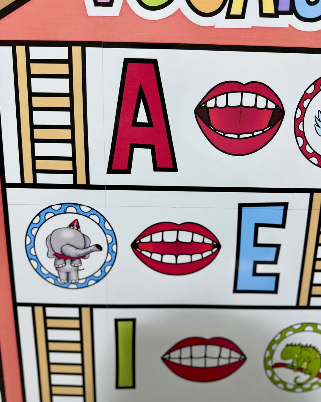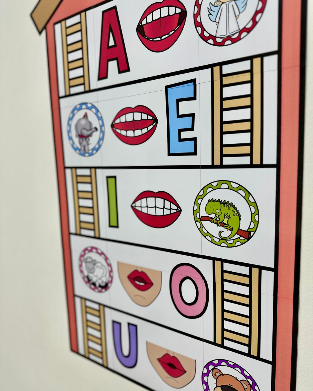 Material ilustrado com figuras que iniciam com cada vogal, e também com as boquinhas fonoarticulatórias representando o som de cada vogal.
