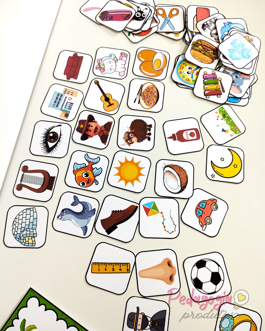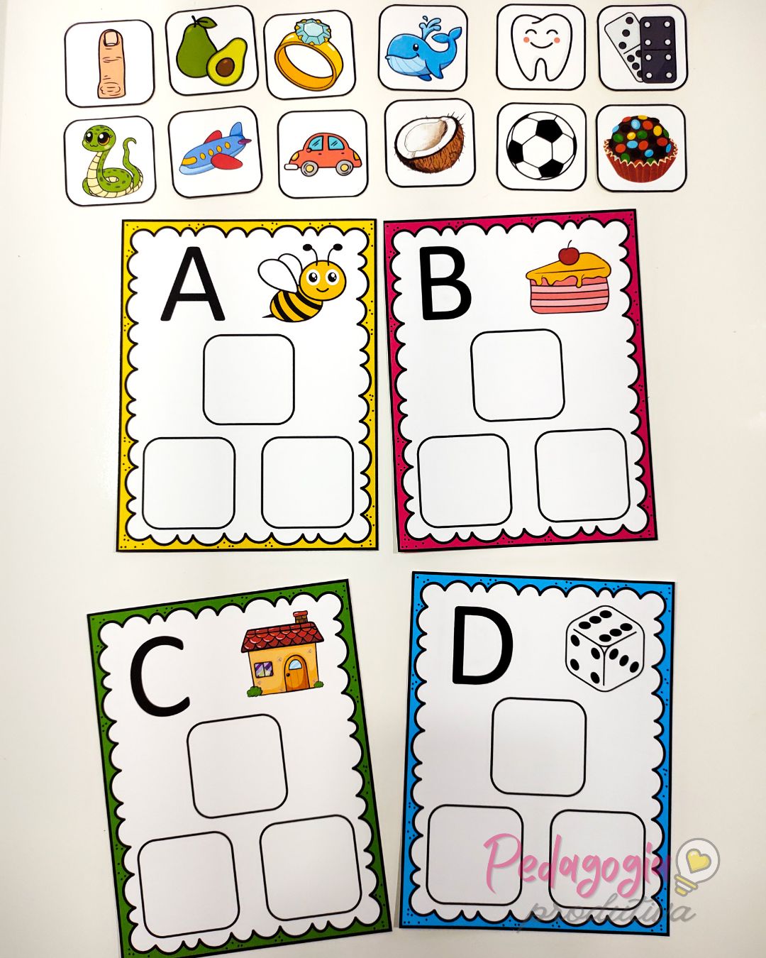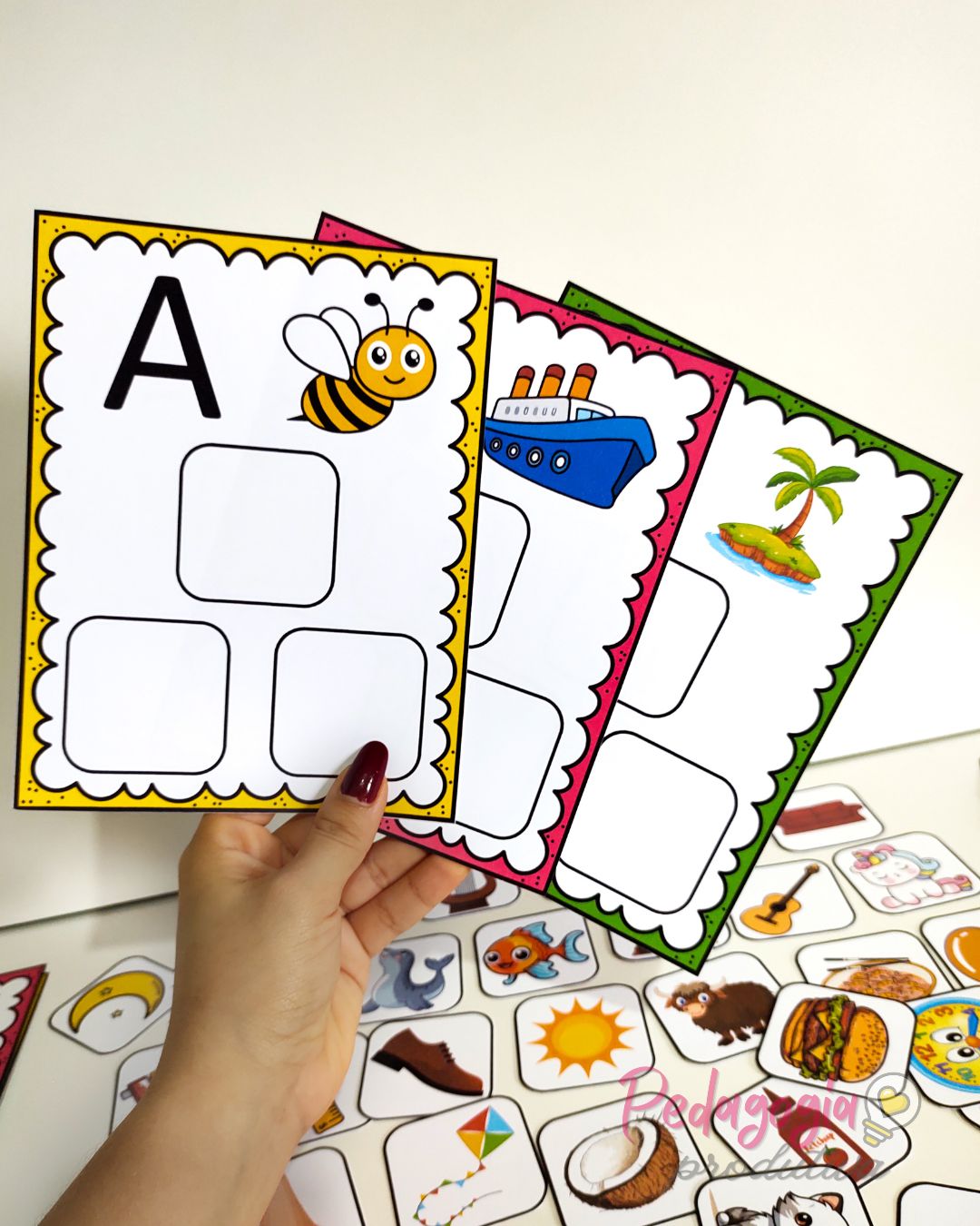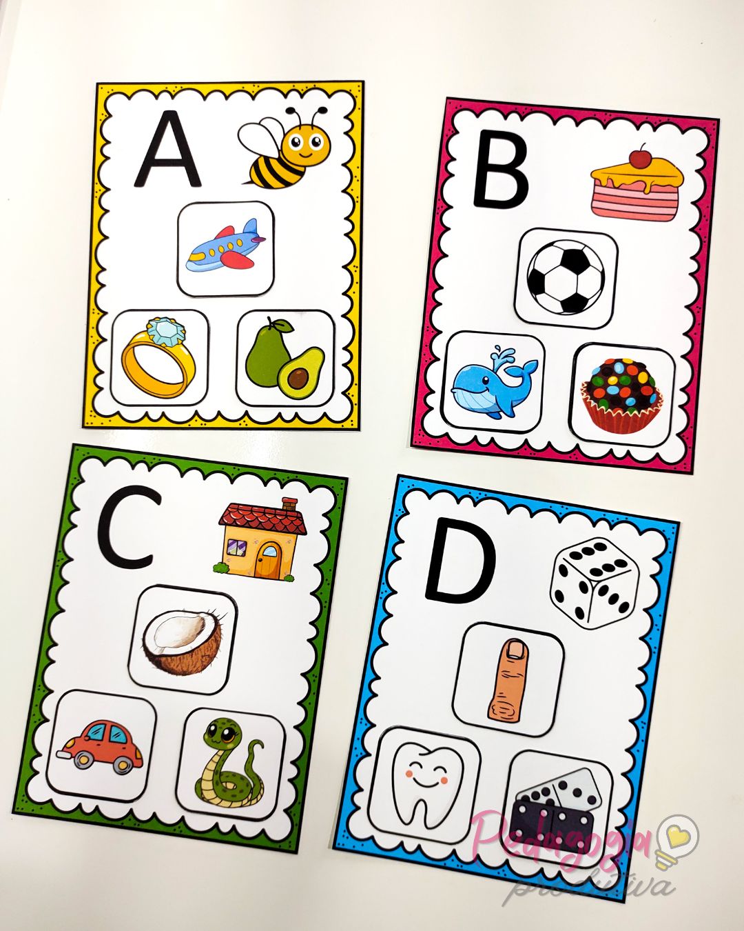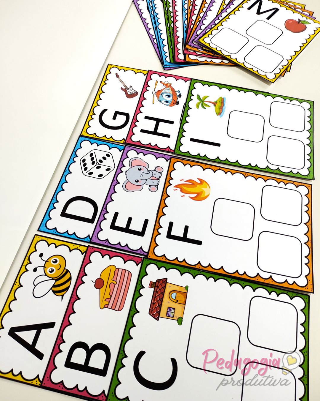 O material traz fichas de todas as letras do alfabeto, acompanhadas de elementos que iniciam com cada letra, estimulando a associação entre som, letra e imagem de maneira clara e prática.