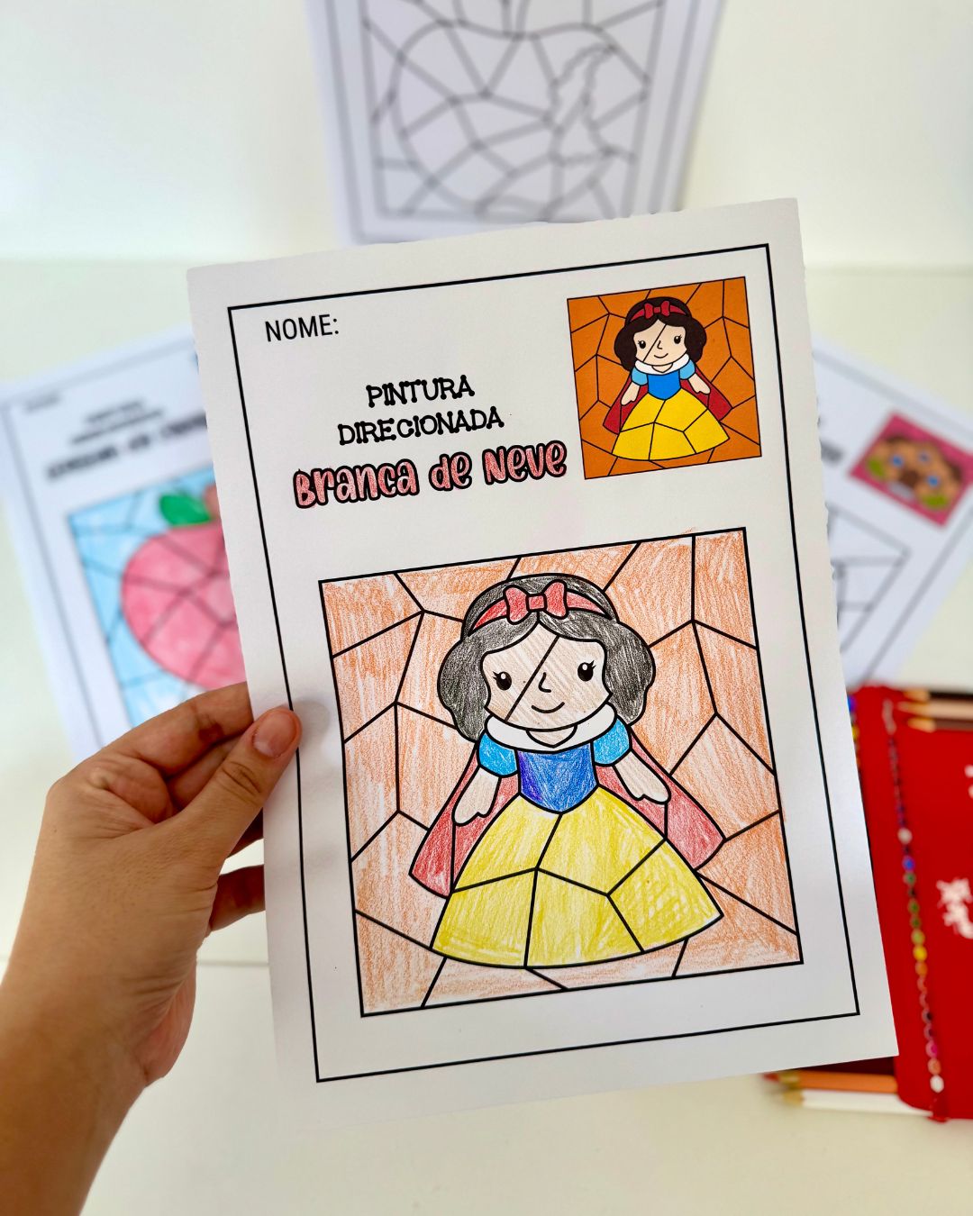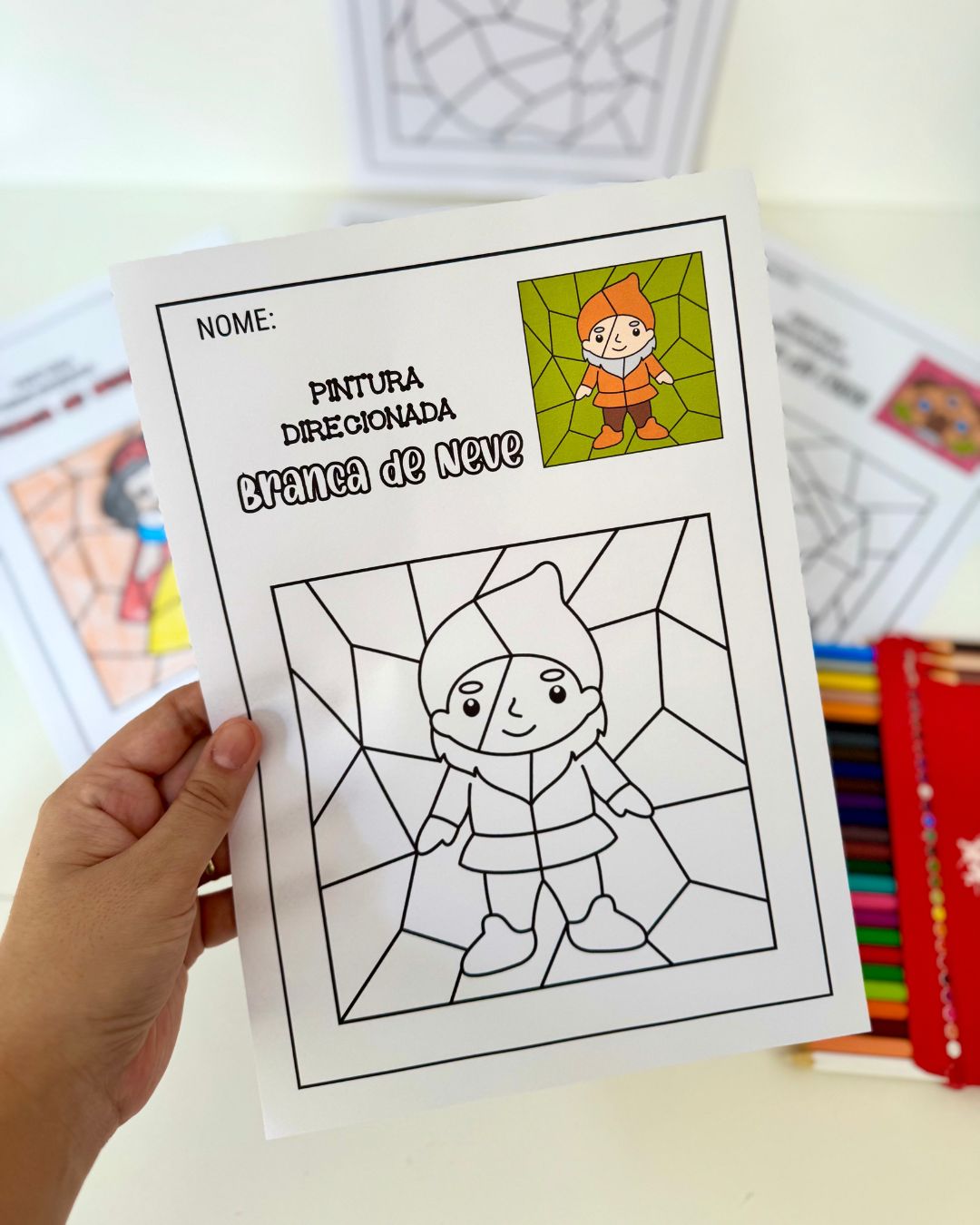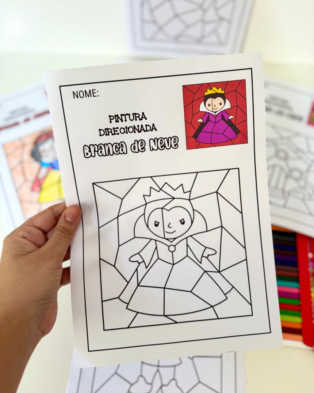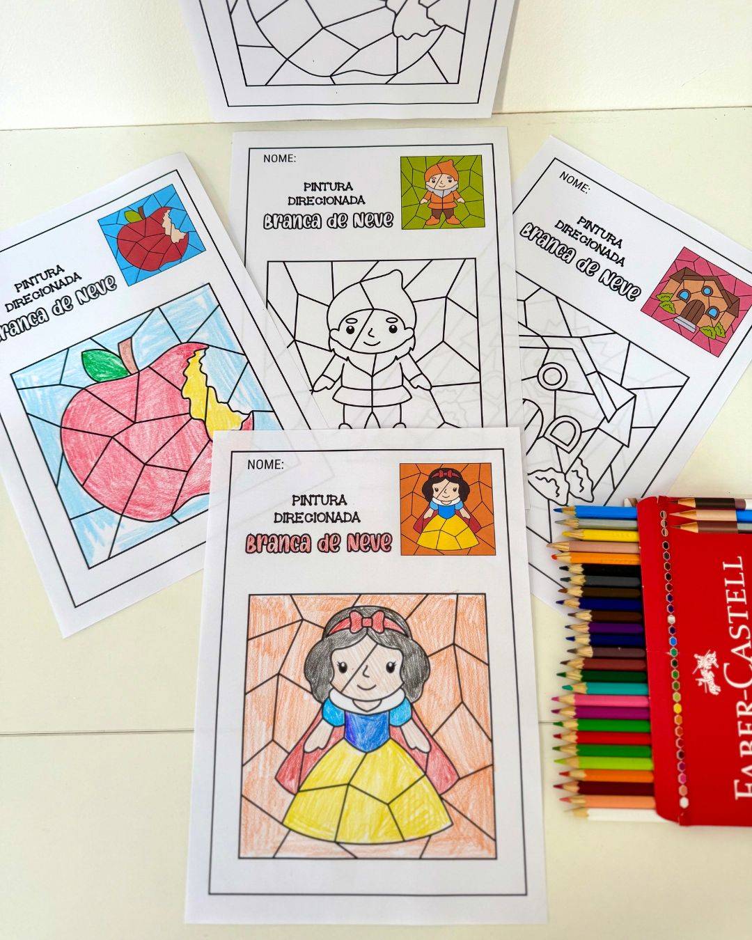 Atividades de pintura direcionada tema Branca de Neve para trabalhar diversas habilidades com turmas da Educação Infantil.