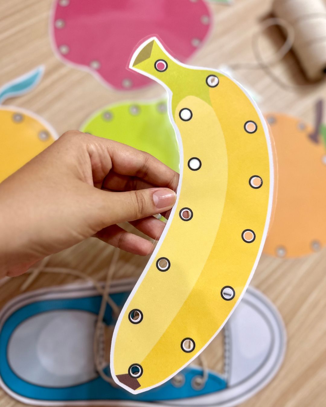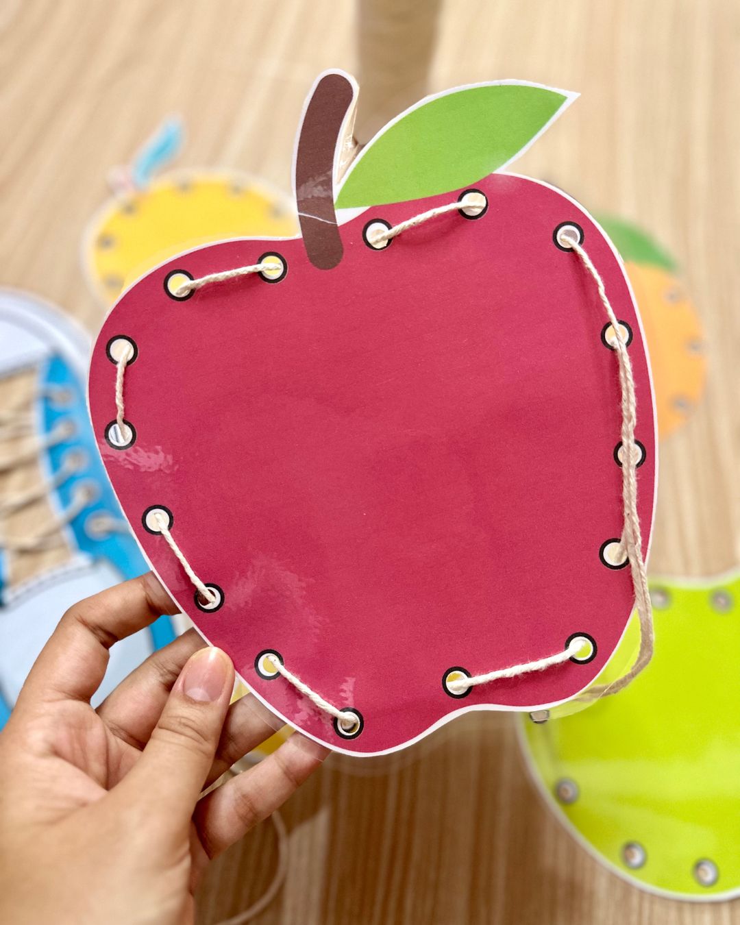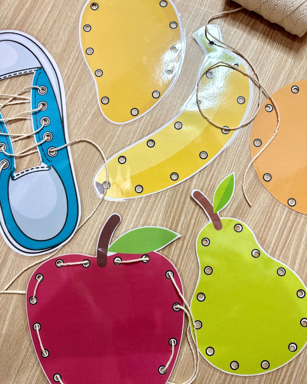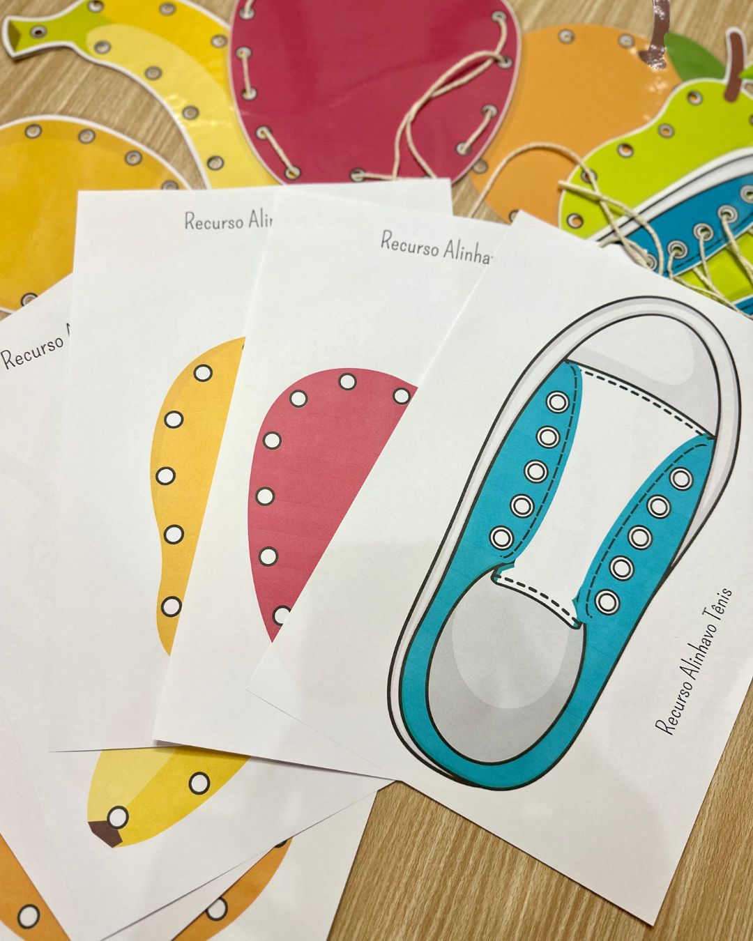 O Recurso Alinhavos inclui 6 pranchas de alinhavos diferentes, com imagens de frutas e de um tênis, para a criança trabalhar a coordenação motora fina através do transpasse de um barbante entre os furos das figuras. Podemos utilizar um barbante com fita crepe na ponta para facilitar o manuseio, ou cordão de tênis.