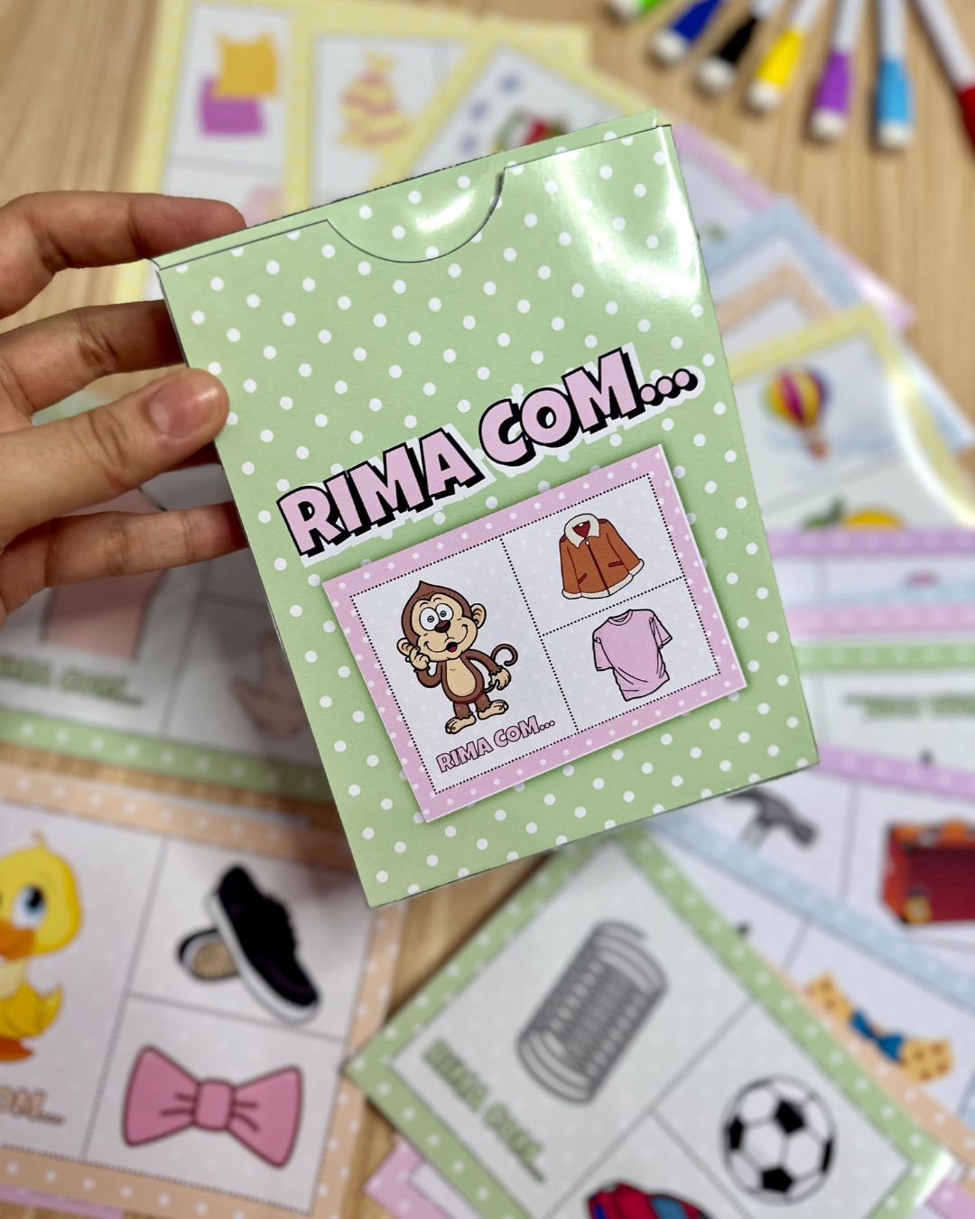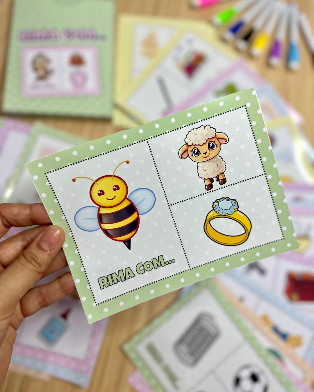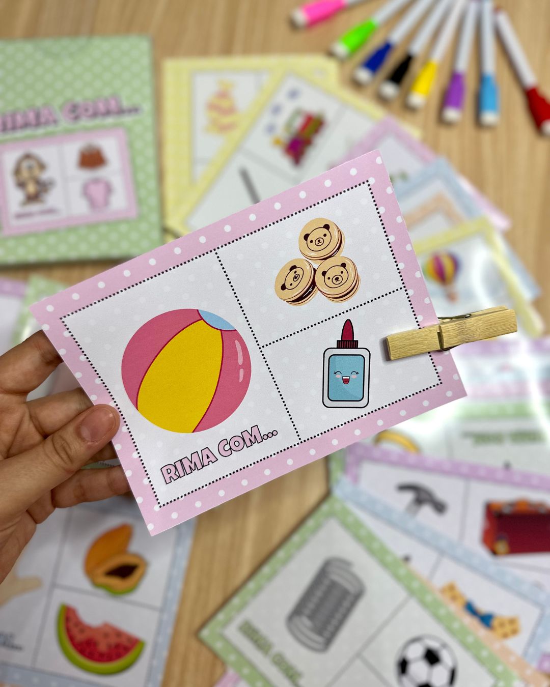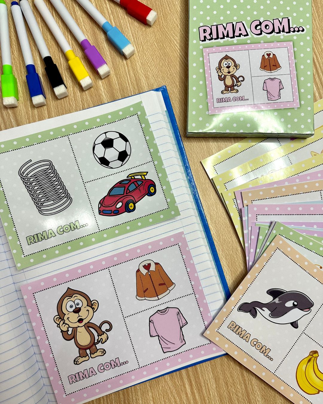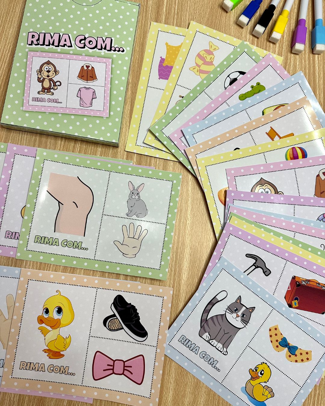 O material inclui 22 fichas para a criança identificar e marcar as palavras que rimam.