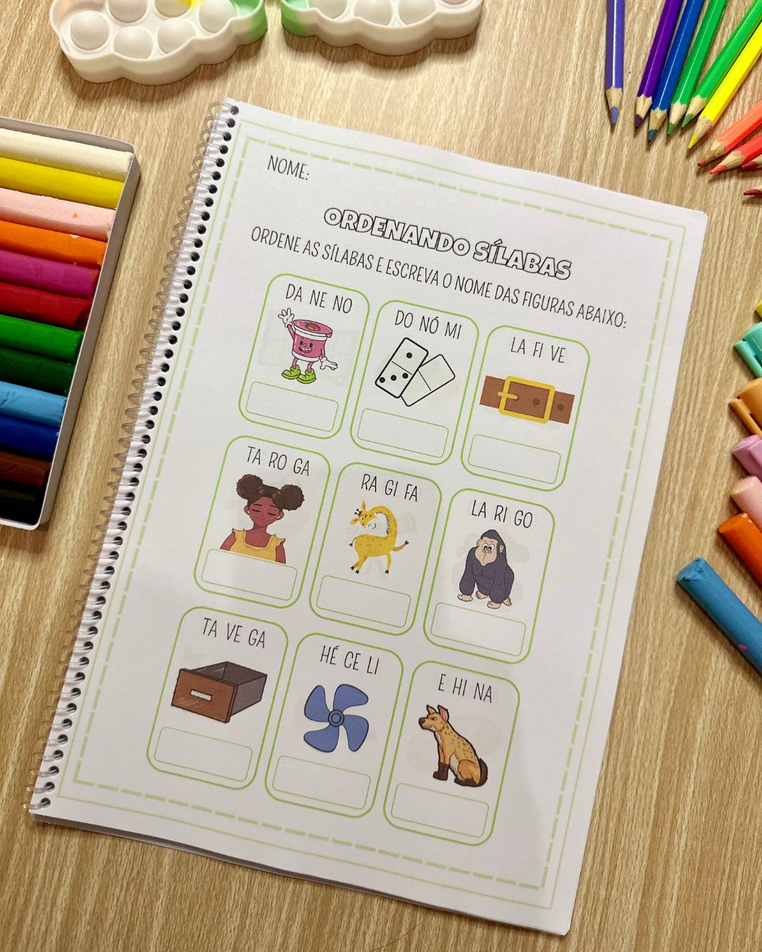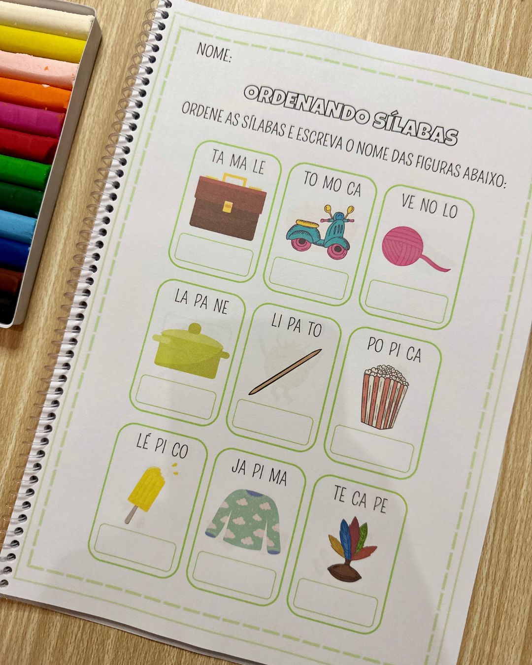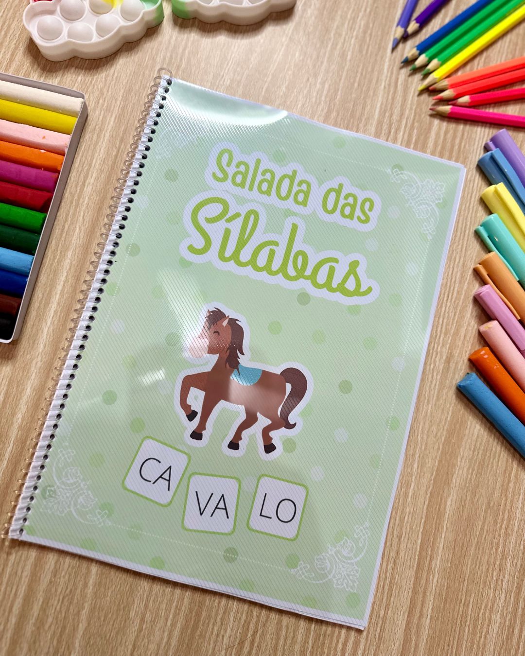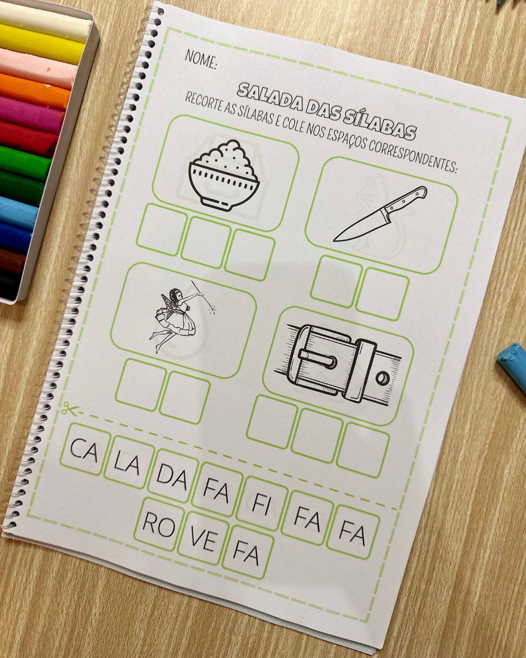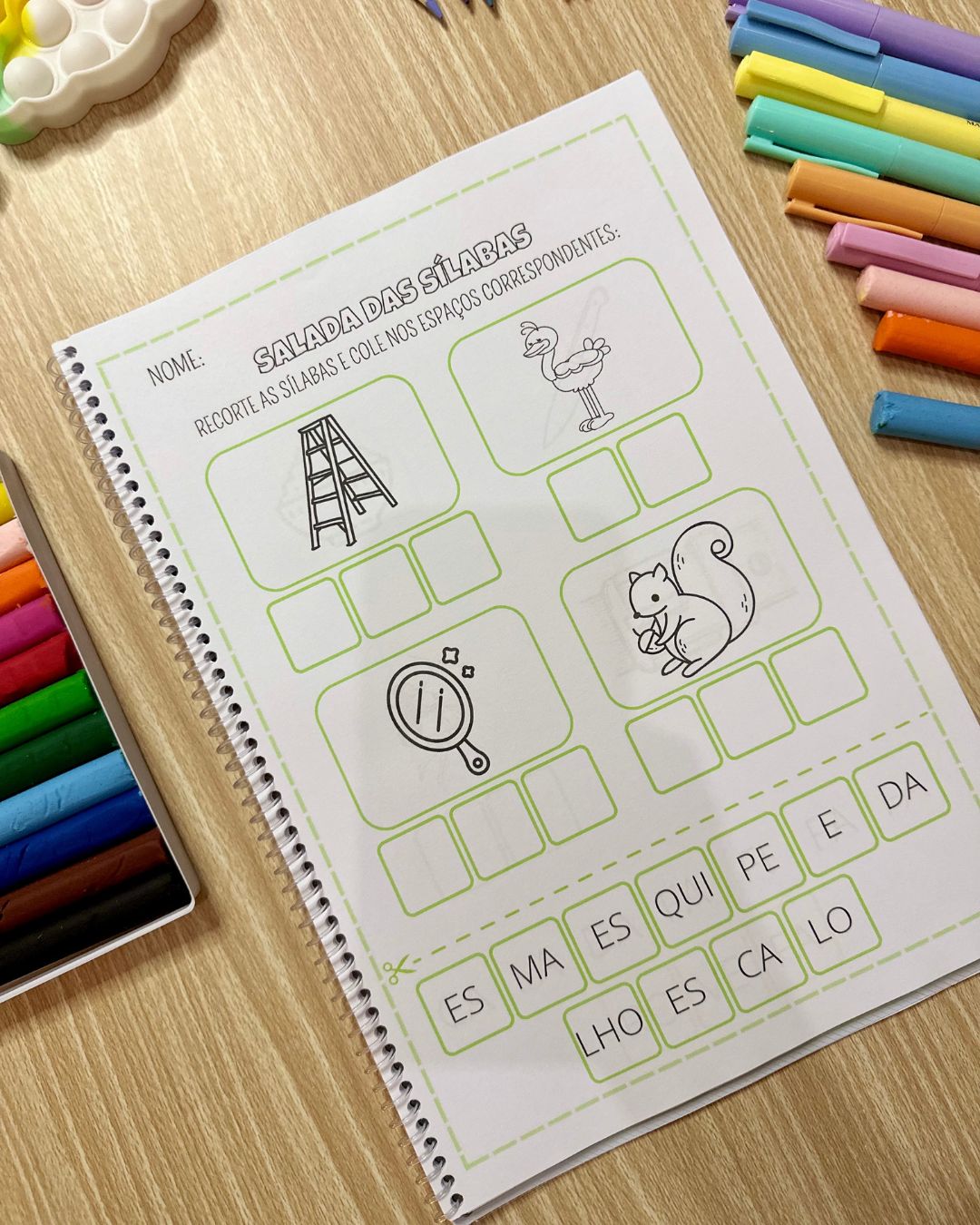 A apostila Salada das Sílabas inclui 32 páginas de atividades com propostas para trabalhar a consciência silábica, a leitura de sílabas e a construção de palavras, de forma prazerosa e atrativa para a criança.
